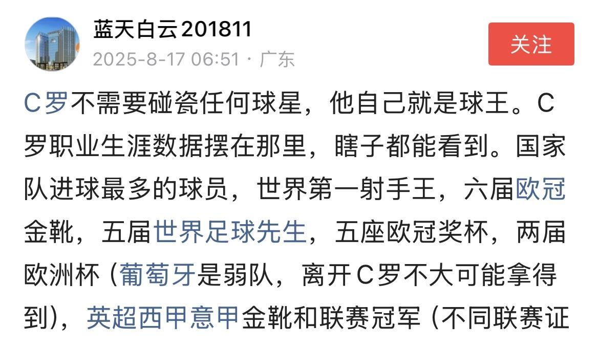在C罗粉丝嘴里,主子有这样的业绩: 两届欧洲杯冠军 欧冠杯五连冠 在不同球队实现欧冠杯三连冠 明目张胆撒谎。