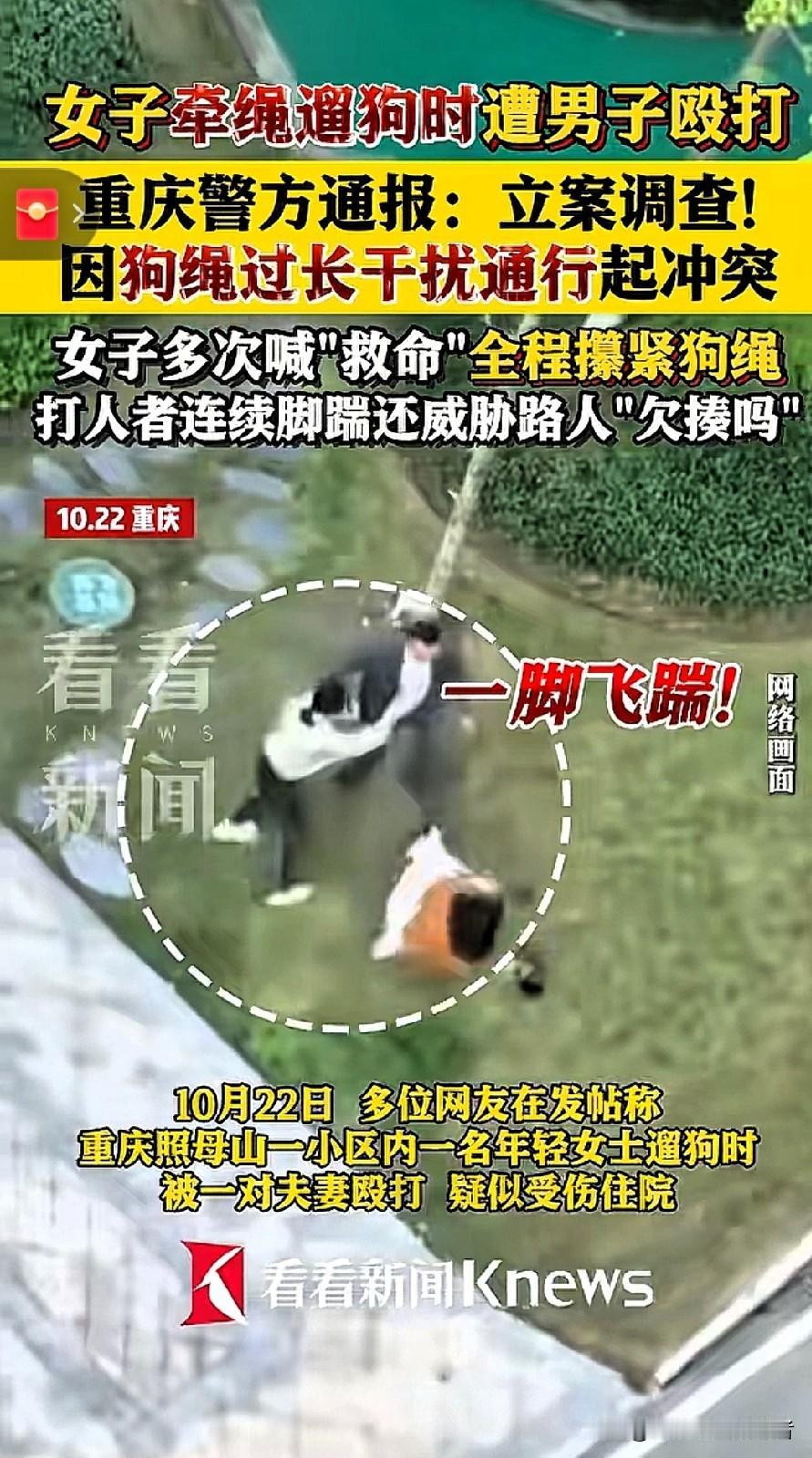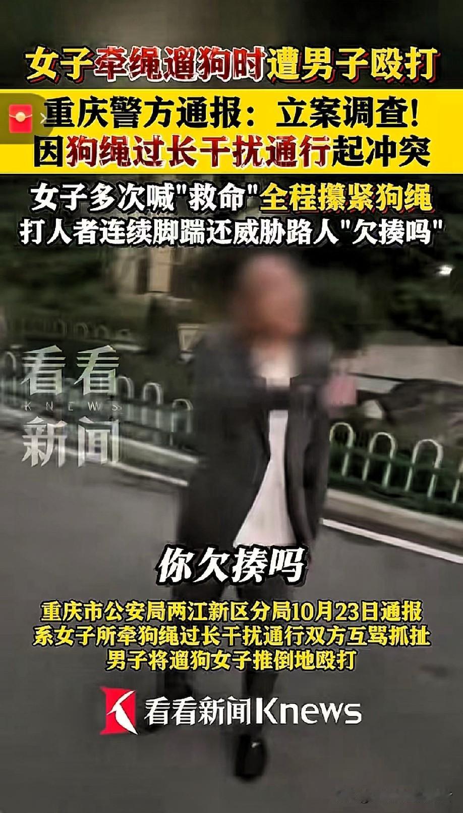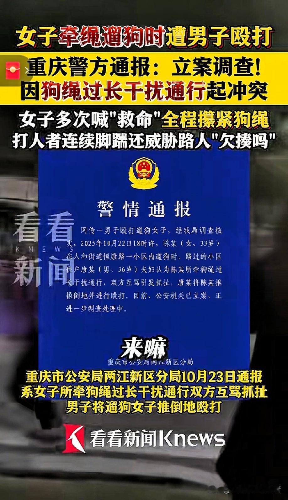 重庆遛狗纠纷升级暴力事件! 女子遭殴打下体出血,施暴者疑为企业负责人欲私了遭拒 10月22日傍晚,重庆两江新区一小区内,33岁女子陈某牵绳遛狗时,与唐某夫妇因"狗绳过长"发生冲突。36岁唐某竟将陈某推倒在地疯狂殴打,导致陈某全身多处软组织挫伤,前后躯干布满伤痕,更出现下体出血的严重症状! 警方已立案侦查!据知情者透露,施暴男子唐某被曝是当地某企业负责人,事后曾试图通过中间人高价私了,但遭受害女子坚决拒绝。目前案件正在进一步调查中。 网友炸锅: "必须严惩!有点社会地位就能随便打人?" "支持女方拒绝私了!这是故意伤害罪!" "遛狗纠纷何至于下此毒手?必须查清是否涉及其它隐私” 法律人士指出,若伤情鉴定达到轻伤以上,施暴者将面临刑事责任。无论身份地位,暴力行为都该受到法律严惩!