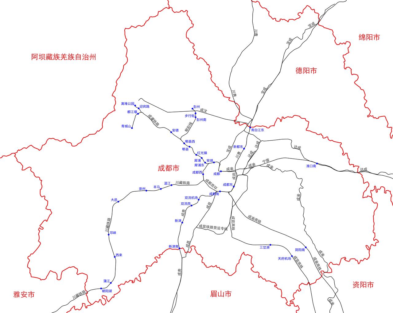 四川省成都市铁路及客运站分布图 根据铁路12306数据,四川省成都市目前有以下36个铁路客运站: 成都站 成都东站 成都南站 成都西站 安德站 安靖站 步行街站 朝阳湖站 崇州站 大邑站 都江堰站 红光镇站 淮口南站 简阳南站 离堆公园站 彭州站 彭州南站 郫县站 郫县西站 蒲江站 青白江东站 青城山站 邛崃站 三岔湖站 双流机场站 双流西站 天府机场站 温江站 西来站 犀浦站 犀浦东站 新都东站 新津站 新津南站 羊马站 迎宾路站