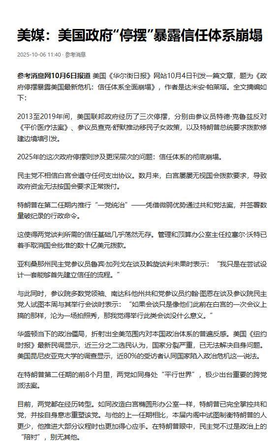 我有预感,美国这次可能要变天了,因为这次事件最大的影响,不是700万人上街,也不是政府停摆,而是制度信任的崩塌。 这真不是危言耸听,10月18日那场席卷50个州的“拒绝国王”抗议,2700多场活动凑齐近700万人,比6月的抗议规模硬生生涨了四成,可这热闹劲儿比起制度信任的裂痕,顶多算场开胃小菜。 明眼人都知道,这次政府停摆,表面是两党在医保福利上吵翻天,实则是党争把“否决政治”玩到了极致,政客们拿着国家运转当赌注搞胆小鬼博弈,眼里只有本党利益,根本不管数十万联邦雇员要无薪休假,国家公园关门砸了旅游业的饭碗。 民主党说共和党不守支出协议,共和党骂民主党搞政治秀,连参议员都坦言“现在缺的就是诚意”,这种互相拆台的戏码演多了,民众自然看透了——这届政客根本靠不住。 更讽刺的是,这已经是美国第20多次停摆,成了个解不开的“无奈循环”,就像破了的水龙头,修不好还没人愿意换,只能看着信任的水哗哗流走。 司法系统这块“遮羞布”也早被扯破了。 最高法院本应是中立的裁判,现在却成了让人质疑的对象,2025年的盖洛普民调显示,只有27%的人对最高法院有高度信心,比2020年降了13个百分点。 更离谱的是,面对2024大选可能出现的法律纠纷,只有20%的选民相信最高法院能公正裁决,哈里斯的支持者里甚至只剩6%有信心。 这可不是空穴来风,特朗普任命的保守派大法官占了多数后,近90%的紧急上诉都站在总统这边,和下级法院94.3%的败诉率形成刺眼反差——移民禁令、关税政策这些争议案件,下级法院刚叫停,最高法院就给暂缓,活像个看风向办事的“墙头草”。 当司法开始偏向政治,民众自然明白,所谓的“宪法守护者”早成了党派工具。 选举制度的信任更是烂到根了。 2021年国会山骚乱那把火没灭,反而烧得更旺,三年过去还有80多个涉案者在逃,“帽衫炸弹客”至今没抓到,可两党却忙着编各自的故事。 特朗普说大选被“窃取”,拜登骂这是对民主的攻击,结果55%的民主党人觉得骚乱是“民主之殇”,大多数共和党人却说“被夸大了”,连“拜登当选合法”这种基本认知,共和党支持者里都只剩31%认同,比2021年还降了8个点。 更吓人的是,23%的美国人觉得“可能得用暴力救国家”,比2021年涨了8个百分点,这说明民众对选举解决问题已经没指望了,甚至开始怀念起“拳头说话”,这哪是民主该有的样子?连信息渠道的信任都崩了,电视新闻的信任度只有11%,追平了二十多年最低,报纸也没好到哪去。 当民众连该信谁都不知道,只能在各种阴谋论里打转——四分之一的人真信“FBI组织了国会山袭击”,这种离谱的说法能传开,本质是大家对所有官方信息都打了问号。 再看经济这块,债务突破35万亿美元,四成人觉得政府快破产了,评价民主制度“失败”的人(38%)都超过说“成功”的(30%),连美国人自己都承认“不如中国团结”,这种发自内心的否定,比任何抗议都更说明问题。 两党自己也快散架了,特朗普把共和党改造成“个人粉丝团”,内阁里连个制衡的人都没有,签行政命令跟玩似的;民主党输了选举就内斗,年轻选民、少数族裔都快跑光了,连自己人都不信领导层。 这种从上到下的分裂,让整个制度成了个空架子——政府停摆、法院偏科、选举撕裂、媒体失信,就像一堆碎木板拼的房子,风一吹就晃,700万人上街不过是推了一把,真正可怕的是,这房子的地基早就烂透了。