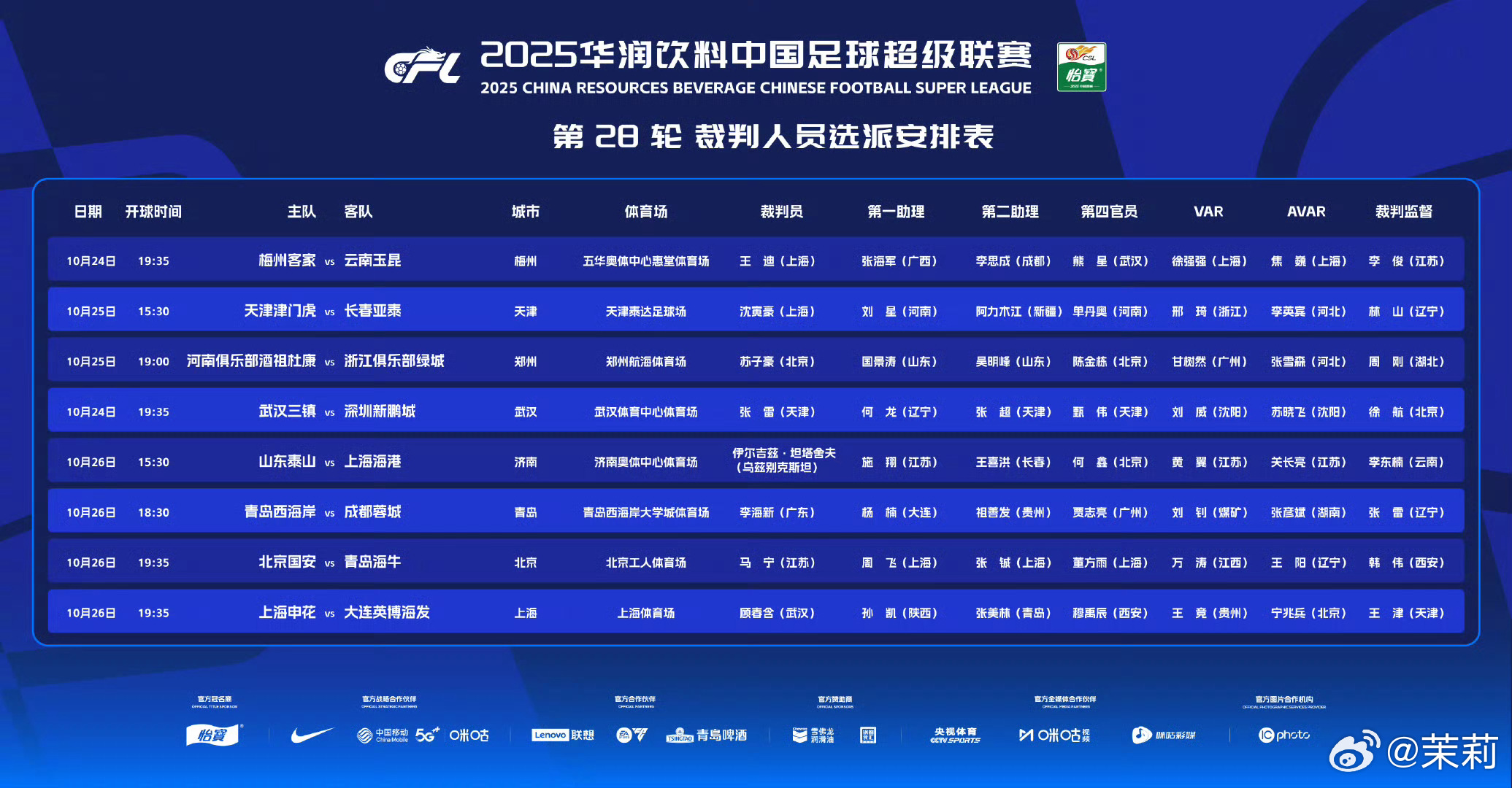 中超联赛第28轮裁判选派结果公布,执法武汉三镇vs深圳新鹏城 比赛的主裁判是张雷(我没看错吧?)VAR是刘威老师。