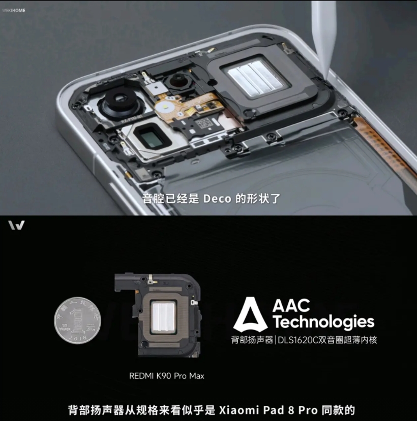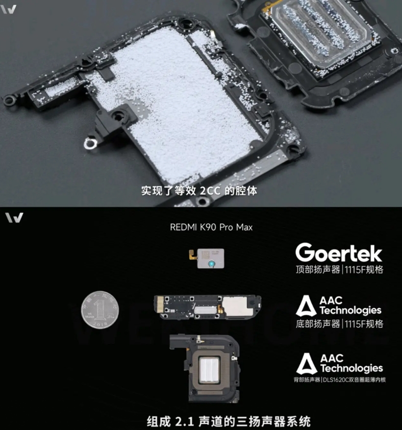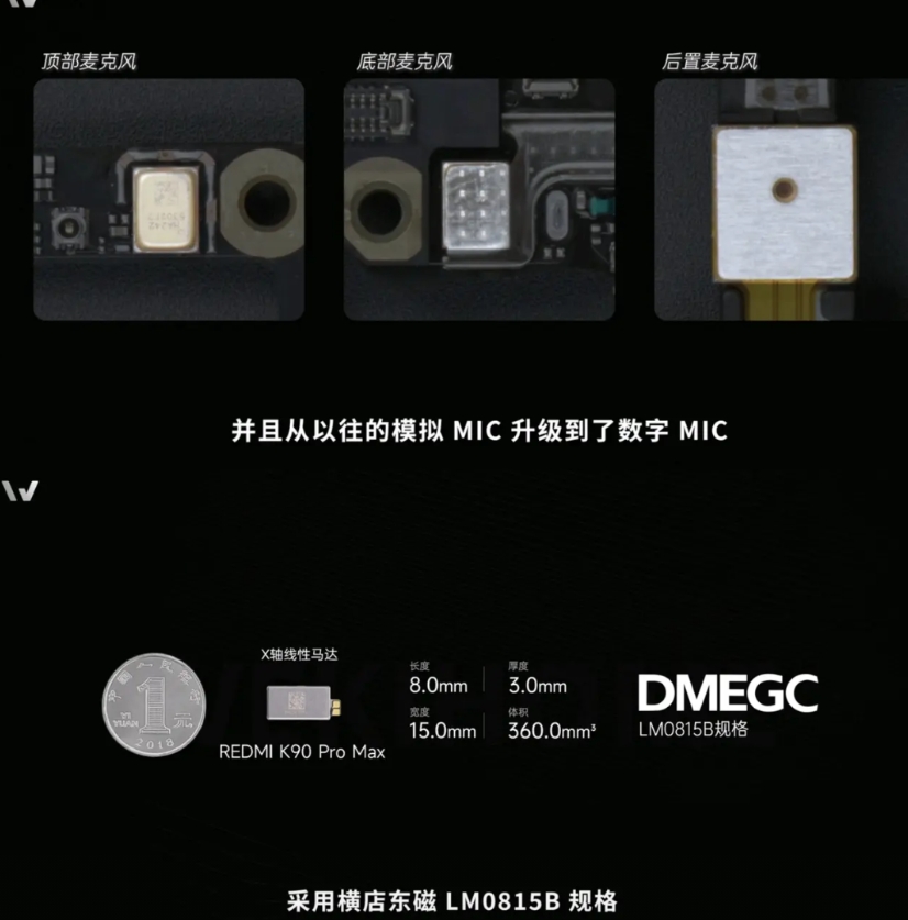 从微机分的Redmi K90 Pro Max拆机视频可以得出: 1、Redmi新增那颗超大1620C扬声器有防尘罩保护,如果经常播放音乐,基本上不用担心进灰。 2、其上下扬声器虽然都是1115F,但供应商不同,上扬声器来自于歌尔声学,下扬声器来自与瑞声科技,1620C大喇叭来自于瑞声科技,和REDMI K Pad同款,三个喇叭均填充了N*Bass声学增强材料。 3、Redmi K90 Pro Max的麦克风也有升级,由模拟麦克风升级为了数字麦克风,收音性能提升。 4、马达升级为了横店东磁的0815B,比之前的0809更强,但性能不及竞品的0816。
