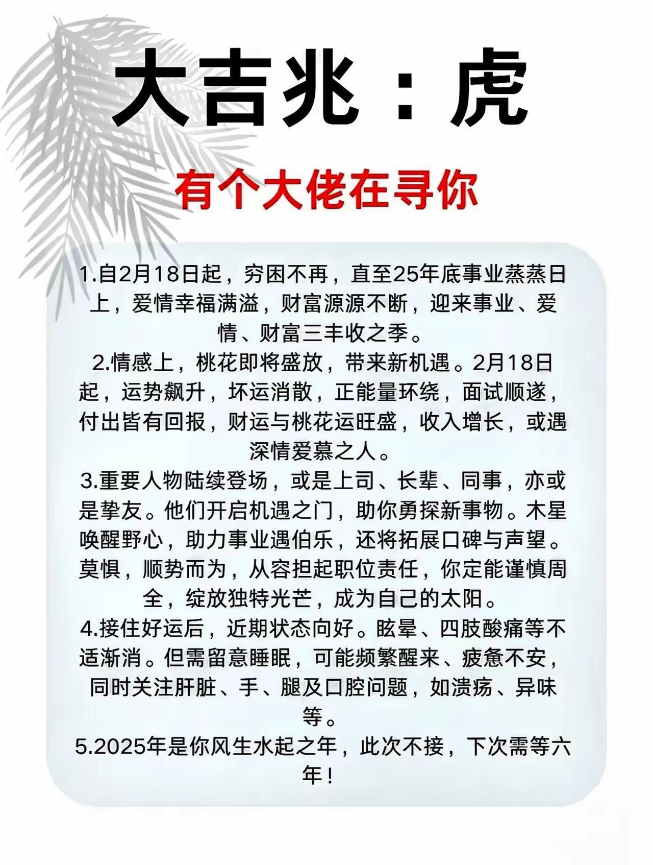 10月24日,属虎的人千万别小瞧了身边的风吹草动,这一天,真的有不少贵人信号在暗中飘感觉就像突然有人在你耳边悄悄说:“来,看这里!”如果平时就习惯自己闯,可能还真会错过那些能帮忙提一把的机会,其实这种事说白了就是要多留心,多听听大家怎么聊,谁在给你提建议,谁主动靠近你谈点新鲜事,谁突然抛来合作意向,这些都不单纯是随口一说,很可能就是下一个助力点。 属虎的性格很多时候都挺带劲的,干活利索,思路也冲得快,但问题就出在这股“快”,有时一拍脑袋就决定了方向,根本懒得理别人的想法,觉得自己能搞定。可是,每个人都不可能全能,尤其在重要节点,谁都希望有个人搭把手,哪怕只是点个头、提个醒都能省不少事。现在已经到了10月24号,属虎的这波人真的要收一收那股子硬气,适当柔和点,多看看身边有没有人主动找你聊点工作上的新思路,或者说生活上有什么新活动,真心说,这可能就是你接下来飞跃的关键时刻。 最近不是有很多职场讨论,大家都在聊“贵人效应”,其实就是你自己再拼,再努力,到了一定阶段,你还是得靠团队和资源来突破。属虎的在这一点一直挺难扭转,以为自己靠冲劲就能突破天花板,但现在情况变了,毕竟社会节奏越来越快,机会藏得也深,不主动抓住别人的建议和资源,总觉得能单打独斗成事,这种想法在10月24号这天可能得改一改了。 要是你身边突然有人主动聊合作,或者提出新的工作思路,别急着推开,也别觉得这又是推销套路,大概率是真的看到你不错,想一起搞点新事,这就是贵人信号。可能你觉得平时就挺能干,但这个时候,放下自我,先听听没准下一步就是事业或生活上的突破口。其实属虎的人一直都冒着冲劲,虽然挺带头,也容易犯点小糊涂,现在就是需要借力使力,一起把事做漂亮。 很多人以为贵人出现会很明显,其实很多贵人信号都挺微妙,比如朋友突然帮你引荐新资源,或者有同事主动邀请你参与项目,甚至家里人突然支招,给你出个主意,都属于搭把手的机会。属虎的这天一定别太急着拒绝,先判断下,别错过了这些能帮忙提一把的机会,毕竟现在身边的人都在忙自己的事,能主动为你考虑的,基本都是愿意拉你一把的。 比较有趣的一点,属虎的在关键时刻容易陷入“我能扛”的状态,感觉自己一步步做就不会错,可是机会来了,不接招,反而容易卡在瓶颈。现在正是10月24号,这一天你可能就会遇到特别主动帮你的人,或者突然冒出新想法的贵人,说不定就是你工作和生活要升级的前奏。反正就算你之前很能干,这一天也要试着放慢节奏,多听听、多交流。 身边的贵人信号其实一直都在,问题是属虎的习惯了快节奏,容易忽略那些细微的变化。要是你愿意在10月24号这天多观察一下,让心态柔和下来,没准就能抓住一两个重要机会,带来新局面。说实话,人生很多时候真的不只是靠自己,关键时刻懂得借力,才叫会做事,属虎的可以试试在这一天主动回应别人的建议和合作,别再关起门来自己闷头干了。 10月24号,说白了就是希望属虎的人别再顶着“单打独斗”的旗,一定要用点心,仔细分辨身边谁是真的想帮你,谁只是路过。只要你愿意接纳新思路和新机会,工作上能有新突破,生活也更顺畅,毕竟贵人信号不常有,每次都是可遇不可求。这一天抓住了,后面路会宽很多,机会总是留给会反应的人。 现在已经到了关键时间点,属虎的人只要抓住身边主动提出新点子的朋友或者同事,哪怕只是一个建议,也能成为你下一步升级的跳板。其实每个人都希望能有贵人相助,只不过属虎的更需要在这一天多看看、多听听、多接纳,别让自己的冲劲覆盖了所有机会。毕竟身边那些愿意帮你的人,才是你接下来真正需要的资源,要是能把这波贵人信号牢牢抓住,突破就不远了