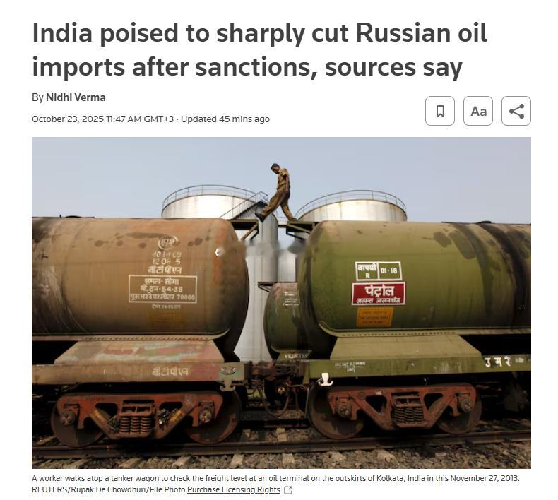 10月23日路透社报道,印度最大的私人炼油企业、俄罗斯原油的主要买家信实工业公司(Reliance Group)计划减少或完全停止进口俄罗斯石油,包括终止与俄罗斯石油公司签订的大型长期采购协议。信实工业在印度运营着全球最大的炼油厂,每日购买近50万桶原油。信实集团近日已从中东和巴西采购现货原油,这些原油可能用于部分替代俄罗斯供应。2022年俄乌冲突爆发以来,印度已成为俄罗斯海运原油的最大买家,今年前九个月平均每日进口约170万桶普京称若战斧袭击俄将强硬回应