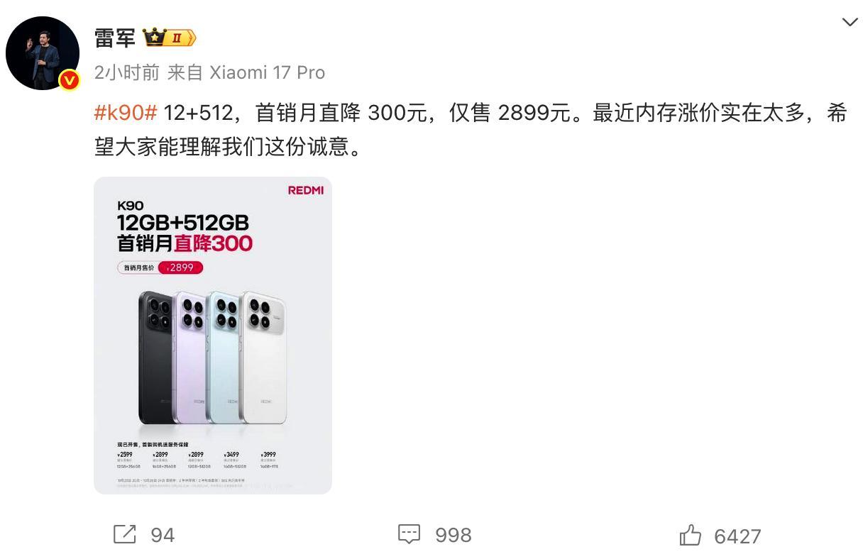 雷军回应K90定价:12+512首销月降价300元,最近内存涨价太多,希望大家理解我们这份诚意。 2899的K90,性价比够可以了吧?