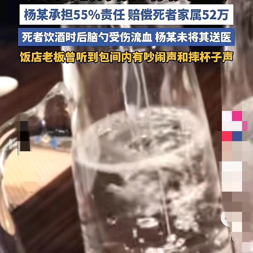 四人饮酒一人死亡 酒局死人不是都要赔! 先行离开的两个人无责!52万赔偿案撕开的真相,看以后还敢使劲儿喝酒吗? 河南那起案子特说明问题,四人喝酒一人死,先走的俩啥事没有,最后陪的杨某却赔了52万 。别以为只要不劝酒就万事大吉,法院判的核心是“有没有管到底”。 杨某错就错在,看见对方头破流血还醉酒,没有及时送医,家人问的时候还未告知其具体位置。这这就说不过去了吧。先走的那两人,要么没喝酒,要么走时人还好好的,所以不用承担责任。 大庆还有个案子更直接,同桌5人连不熟的、没喝酒的都赔了钱,就因为没把醉酒的人安置好 。 说到底,大家一起喝酒,就要承担起责任,一定不要劝酒,遇到突发事件及时应对,以免造成严重的后果。饮酒致死 酒后致死 酒席悲剧 喝酒死亡赔偿 聚餐猝死 酒宴悲剧 河南醉驾致死