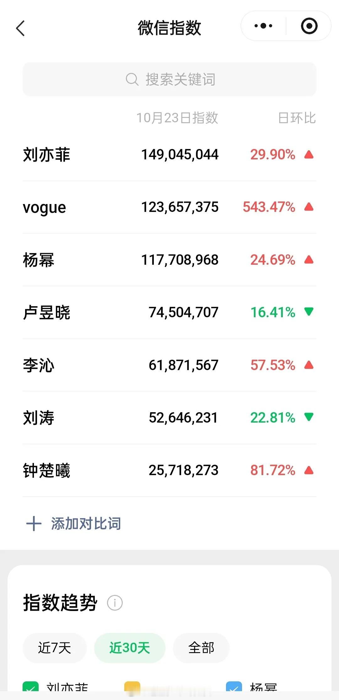 vogue盛典部分艺人微信指数情况,刘亦菲星光还是强啊,杨幂紧随其后,看开刘冲选的 c 位还是很准的吧,卢昱晓是因为衣服太丑而出圈了吗?其实感觉今天最大的话题在钟楚曦这里吧[允悲][允悲]
