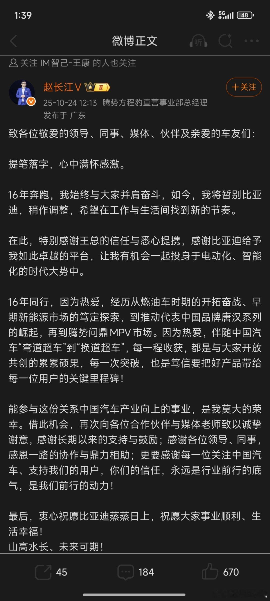 长江哥哥去哪里了?比亚迪赵长江辞职