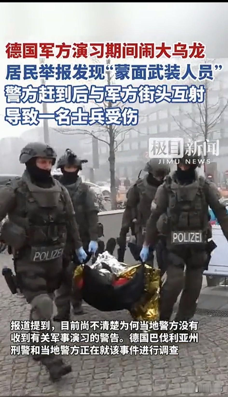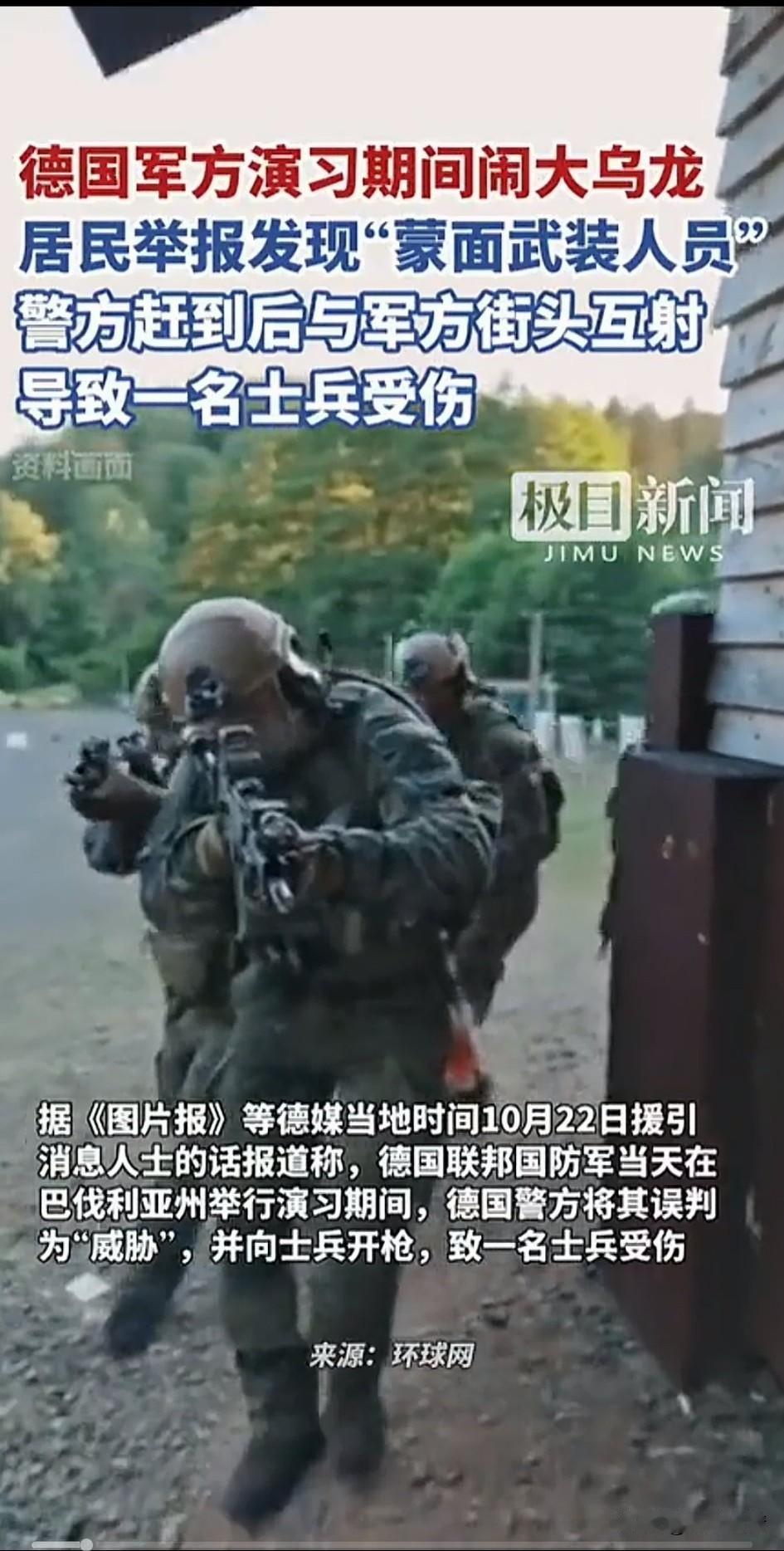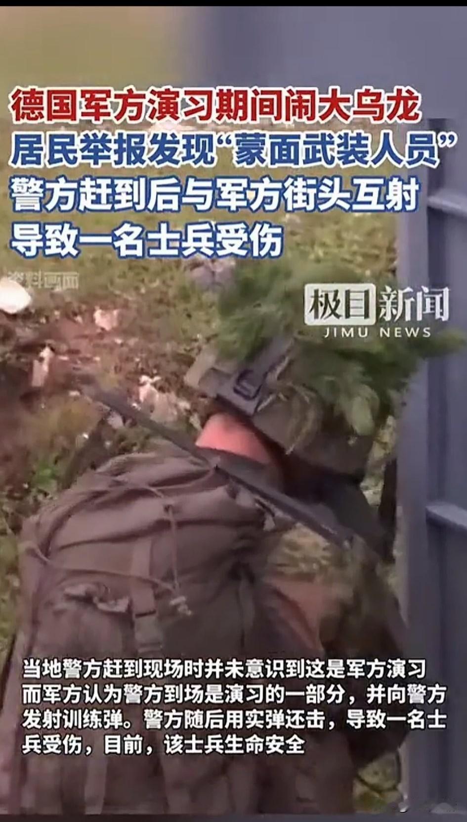 德国军方演习闹乌龙, 因为没有提前告知当地, 结果居然发现蒙面武装人员后, 立刻报了帽子叔叔, 当地帽子叔叔也是反应迅速, 到场后隔着老远看到了蒙面武装, 以为是恐怖分子, 军方士兵以为帽子叔叔到场是演习一部分,立刻用训练弹开火, 帽子叔叔也不怂, 直接用手中家伙招呼, 结果双方互射数分钟, 一名士兵不幸中弹受伤, 双方发觉不对后这才停火, 靠近后这才发现都是自己人, 这只是演习而已, 立刻报告了上级, 当地刑警正在调查为什么没有收到通知,不得不说当地帽子叔叔战斗力惊人,军队这回算是吃了哑巴亏, 如今涉事人员还要接受调查, 这乌龙事件闹得全世界都在看笑话! 大家觉得德国这次演习乌龙到底怨谁? 德国德国那些事儿 德国安保 欧洲武装部队