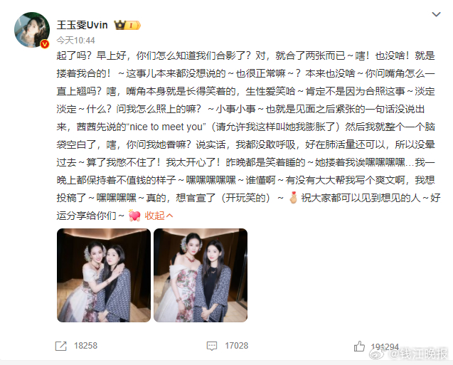 #王玉雯 想和刘亦菲官宣了#【王玉雯终于跟偶像刘亦菲合照了】#林一转发正式恭喜王玉雯# 10月24日,晒跟刘亦菲合照,“搂着我合的”,“见面之后紧张得一句话没说出来,茜茜先说的‘nice to meet you’,然后我就整个脑袋空白了”,“我都没敢呼吸,好在肺活量还可以,所以没晕过去~算了我憋不住了!我太开心了!昨晚都是笑着睡的~她搂着我诶嘿嘿嘿嘿…真的,想官宣了(开玩笑的)~祝大家都可以见到想见的人,好运分享给你们~[给你小心心] ”
