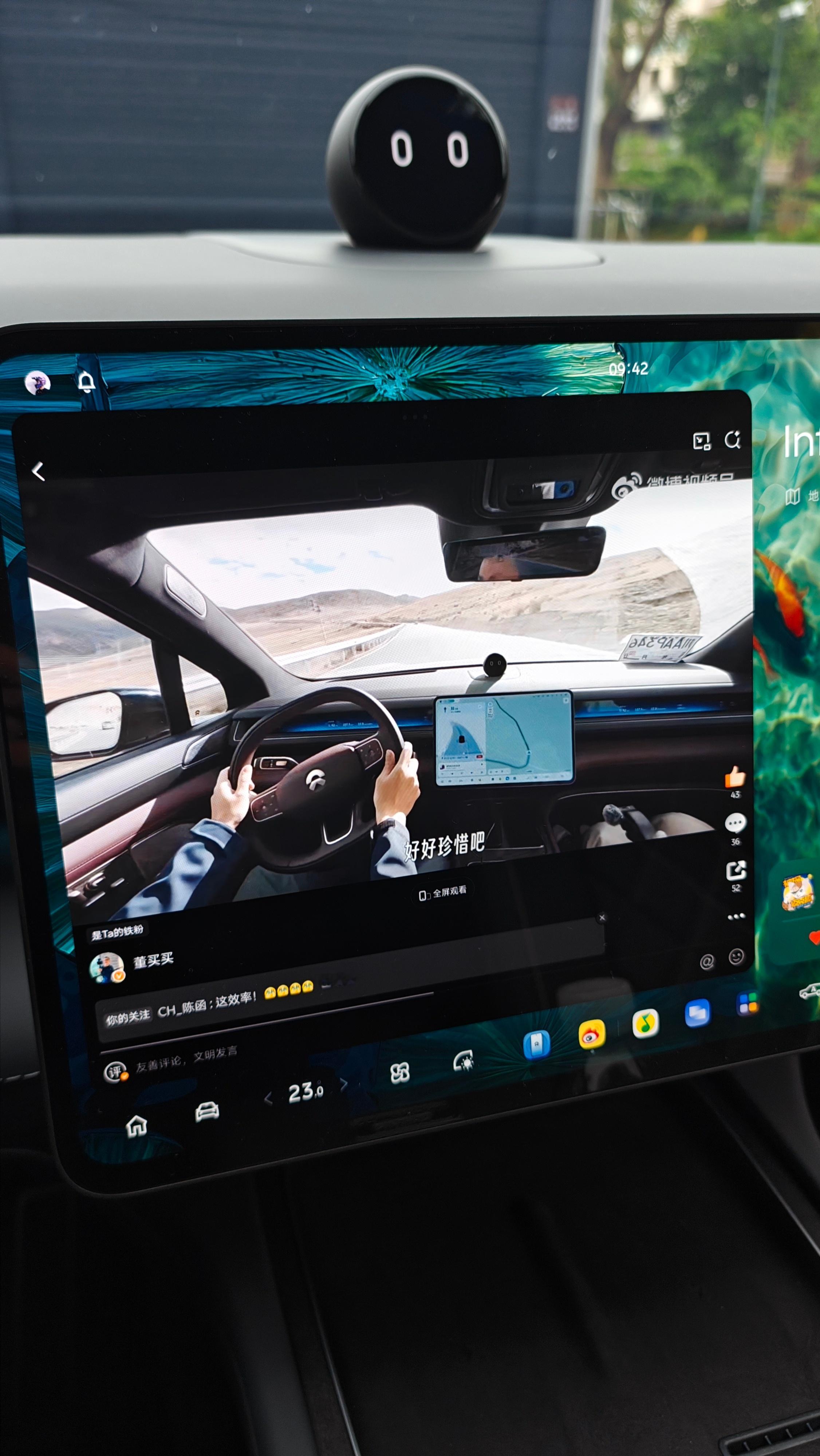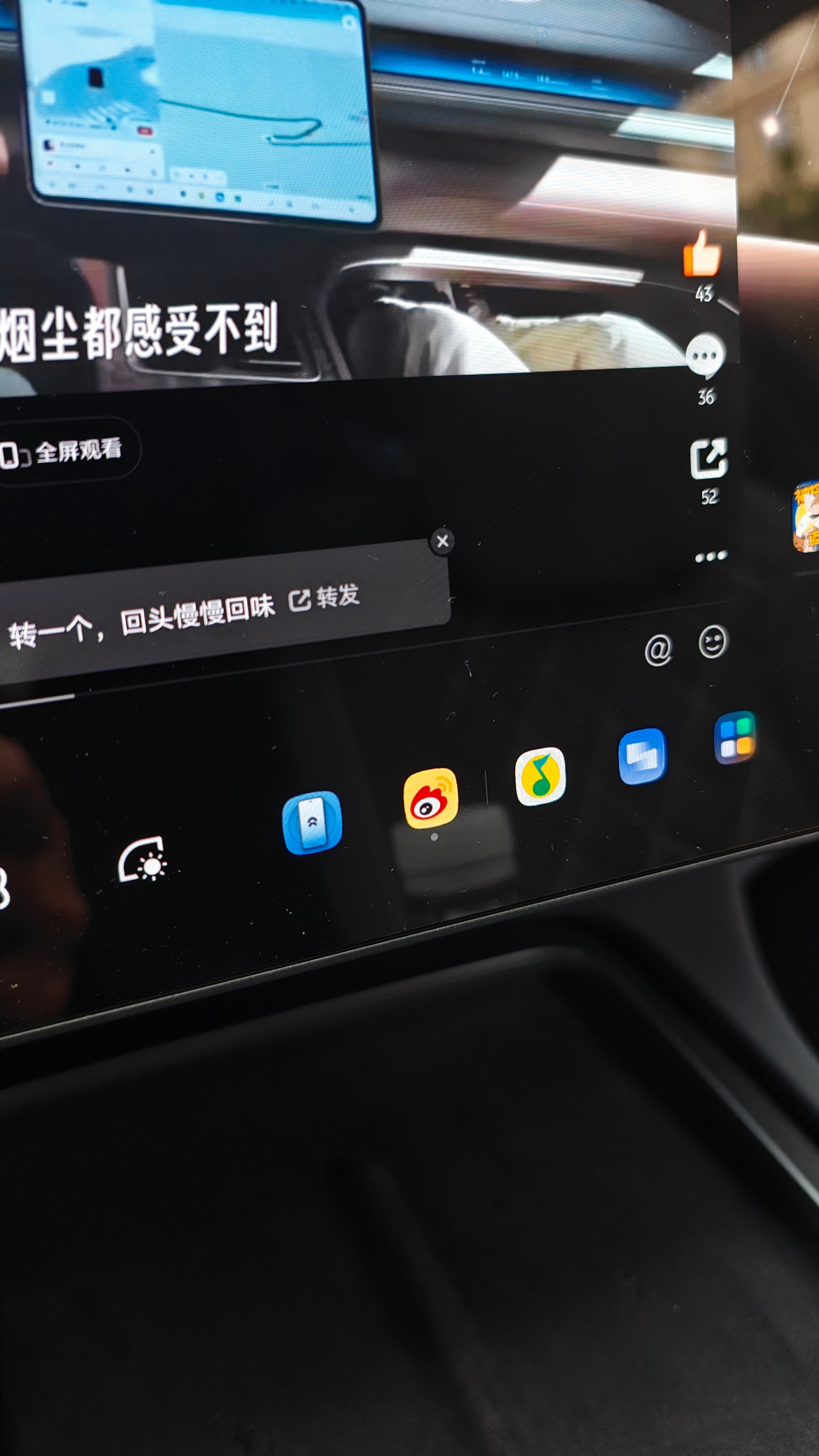 接上一条,你从后座走到前座也不用担心,下拉手机页面,按那三个点,就能直接操作流转到中控屏,中控屏下方会出现流转app的图标,所以微博的图标就显示在这里,你可以操作车机,然后点击微博图标回到视频画面,真的太好用了。但大家不要开车看电视哈。