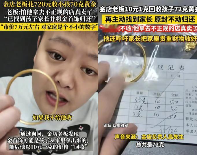 四川雅安一名男子以10元一克的价格,回收了一个孩子重达72克的金手镯,他给了这个孩子720元,但其实这个金手镯价值70000多元,不过视频传上网后,所有网友不仅没有斥责男子,反而夸赞他的做法非常正确... 最近在网上,四川雅安天全县一位金店老板的做法被很多人点赞,有人说他“把良心比利益看得重”,也有人说“这才是做生意该有的样子”。 大家讨论的,是一笔看起来很不合理的交易——他用720元,收了一个孩子拿来的72克黄金,要知道,按当时的市场价,这些黄金至少能值七万多。 这场热议的源头,其实是一位女士的感谢。 那天下午,距离交易完成才一个多小时,这位女士就急急忙忙赶到了金店,手里攥着720元现金。 她一见到店主就红了眼,说自己收拾房间时发现婆婆留下的黄金饰品不见了,幸好邻居告诉她社区群里有店主发的视频,不然真不知道该怎么办。 确认饰品是自己的后,她当场退了钱,反复说着“这是家里的念想,丢了就找不回来了”。 很少有人知道,在这位女士赶到之前,店主已经做了不少准备。 交易完成后,他没把黄金饰品入库,而是立刻拍了视频。 视频里,饰品的款式、称重时电子秤显示的72克、手写的720元回收收据,都拍得清清楚楚,还特意说明“家长看到请联系,退钱就能领回饰品”。 除了把视频发到当地十几个社区群,他还专门跑了趟派出所,拜托民警帮忙留意有没有家长报案丢了黄金饰品。 时间倒回交易当天上午,金店里的场景其实有些热闹。 一个十一二岁的孩子攥着布包走进来,说要卖里面的东西。 店员打开布包,发现是件黄金饰品,称重后报出72克。 周围等着买首饰的居民都以为店主会按市场价核算,没想到他只报了720元。 有熟客忍不住问:“你平时挺实在的,怎么跟孩子做买卖这么‘小气’?” 店主没多解释,只说“等两天你们就明白了”,孩子拿了钱,攥着现金很快就走了。 店主之所以这么做,其实是早就发现了不对劲。 孩子刚进店时,他就注意到两个细节:一是那黄金饰品是2008年左右的老款式,跟孩子的年龄完全不搭。 二是问起“家里人知不知道你来卖这个”,孩子眼神躲闪,支支吾吾说不出家长的联系方式。 这两点让他心里有了判断:这饰品大概率是孩子偷偷从家里拿的,不能按常规方式处理。 在决定用720元收下之前,店主其实排除了两种处理方式。 按市场价收吧,孩子能拿到几万块,说不定会觉得“偷卖家里东西能赚钱”,以后还会犯同样的错。 思来想去,只有低价收下最稳妥——既保住了饰品,又不让孩子尝到“赚快钱”的甜头。 后来店主接受当地媒体采访时说,自己也有个和那孩子差不多大的儿子,特别能理解家长丢了贵重东西的着急,能帮上忙就帮一把,没什么特别的。 其实像这样的事,之前也发生过不少。 比如有个城市的文具店老板,看到小学生拿着名牌手表来卖,没拒绝也没低价收,而是通过学校找到家长。 还有废品回收站的老板,收到少年卖的祖传铜香炉,赶紧联系文物部门送回了家。 这些老板的做法虽然不一样,但本质上都一样:没把眼前的利益放在第一位。 做生意确实是为了赚钱,可真正能长久的生意,从来都少不了良心和温度。 就像雅安这位金店老板,看似做了笔“亏本买卖”,却帮一个家庭守住了珍贵的念想,也赢了大家的认可。 这样的生意经,比赚多少快钱都更有价值。 那么如果是你们会这样做吗? 如果各位看官老爷们已经选择阅读了此文,麻烦您点一下关注,既方便您进行讨论和分享,又能给带来不一样的参与感,感谢各位看官老爷们的支持!