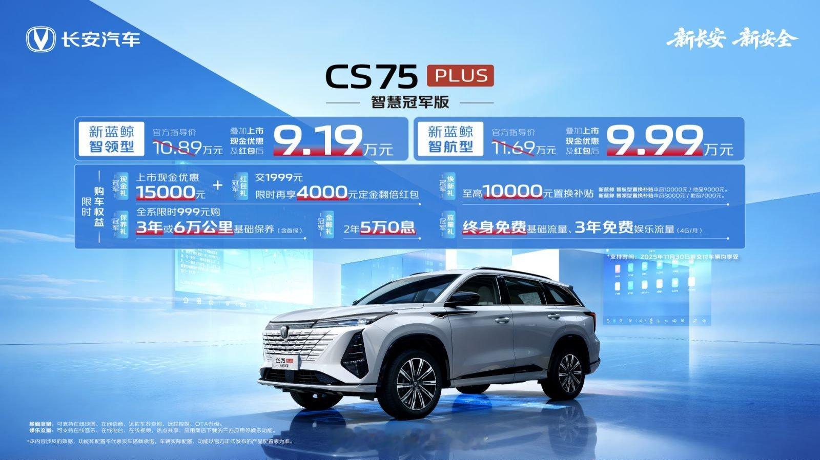 长安CS75 PLUS 智慧冠军版焕新上市,叠加现金补贴及无门槛置换补贴后限时9.19w起。