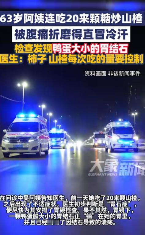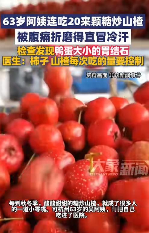 “防不胜防!”10月24日,浙江杭州,一6旬老人连吃20颗糖炒山楂后,肚子疼得直冒冷汗,到医院检查后她才得知,自己的胃里竟长了个鸡蛋大小的胃结石!网友:好吃也不能贪多啊! 秋冬季正是各类山楂零嘴热卖的季节,冰糖葫芦、糖炒山楂深受人们的喜爱,可再好吃的东西,吃多了也会出问题。 一63岁的老人平时喜欢吃山楂,糖炒山楂是她的最爱,这天,老人连吃了20颗糖炒山楂,没想到当晚她的肚子就开始剧烈疼痛,疼得她直冒冷汗,一夜没睡好。 无奈之下,老人到医院就医,通过胃镜检查,她的胃里居然有一颗鸭蛋大小的胃结石,并且周围已经出现了溃疡,情况已经比较严重,所以老人才会出现剧烈腹痛的症状。 胃结石的出现和老人的饮食习惯有关,山楂里的鞣酸等成分,遇胃酸易和蛋白质、果胶抱团形成胃石,过量食用山楂大概率会导致胃石症,虽然这也和基因、身体状况有关,但最好不要抱有侥幸心理。 不少人觉得就算山楂好吃也不能贪多,水满则溢,适量食用山楂对身体有哦不少好处,控制好量,不要贪嘴! 信息来源:《63岁女子狂吃20多颗糖炒山楂腹痛后送医,胃里长出鸭蛋大小的胃结石!》大象新闻