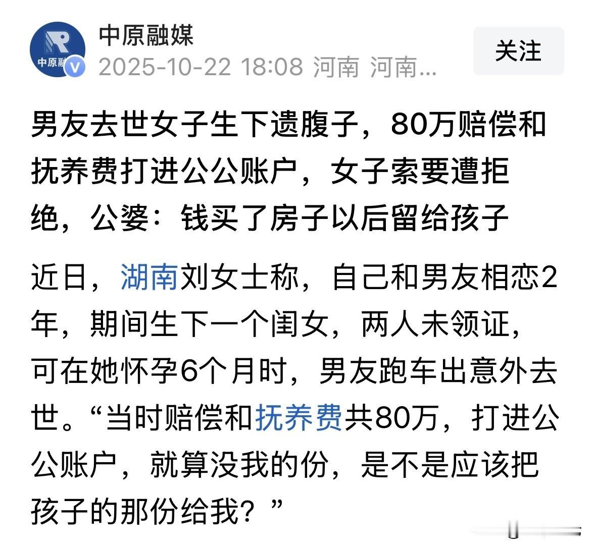 湖南,女子未婚先孕,就在她怀孕6个月时,男友竟意外去世,80万的赔偿款和抚养费全部打进公公账户,女子向公婆索要她和孩子的那部分,公婆拒绝了,说女子是外人,没资格要钱,女子退一步,说只要孩子那部分,却又遭到拒绝,公婆表示儿子走前特意交代,钱要留着给娃买房,女子想来住可以随时来。然而,女子却觉得公婆是在千方百计防着她,这让她心里很不好受。 2023年,刘芳(化名)挺着6个月的肚子,天天以泪洗面。 她和男友张强(化名)相恋两年,没领结婚证就怀了孩子,本以为能组成个温暖的小家,谁知天有不测风云,张强跑长途货车时出了严重车祸,再没醒过来。 后来,刘芳独自把孩子平平安安生了下来,公婆看着孩子出生,也挺高兴,没事就搭把手帮刘芳照顾孩子。 刘芳得知80万的赔偿款和抚养费已经打进了公公的账户后,就开口让公婆把属于她和孩子的那部分钱给她,这样她和孩子日后也有个保障。 然而,公婆却表示,说句难听的,你还没进门,就算个外人,这钱肯定不能直接给你。 刘芳一听,说是,我俩当初没来得及结婚,算个外人,可就算没我的份,孩子那部分总该给我吧? 然而,老两口还是拒绝了。 公婆表示,当初儿子临走前特意嘱咐,赔偿款拿出一部分用来给孩子买套房,这钱我们没动,就等着孩子买房呢。孩子我们现在也在帮你带,等房子下来了,你要想来,随时过来住。 原来,赔偿款分配时,因为孩子还没出生,80万里包含了老人的赡养费和孩子的抚养费。 公婆曾提议把孩子户口迁到张家,让刘芳带着孩子和他们一起生活,但被刘芳拒绝了。 刘芳觉得,自己还年轻,总不能一辈子耗在这里,她想手上有钱了就带孩子走。 然而,现实比想象中艰难。孩子半岁时,刘芳在外面找工作,每月挣不了几个钱,交完房租剩下的钱根本无法承担起她和孩子的开销。 所以,她才找公婆要钱,但她能感觉到,公婆一直在防着她,生怕她把钱卷跑似的。 刘芳每每想到这些就难过得直掉眼泪,她不是没想过打官司,可一想到孩子从小公婆也帮着带了,又下不了决心。 公婆也很委屈,儿子走后,留下的孩子是他们唯一的念想,他们会全心全意对孩子好,钱也留着给孩子上学、买房,这有错吗? 有人说,当事人应该明白一个最基本的法律常识:第一,你只是女朋友,不是配偶,没有继承权;第二,你的孩子在你男朋友去世时没有出生,她没有继承权;第三,你男友已经去世,他的父母没有义务出抚养费。以上都是民法典明文规定的,不接受反驳。 看得出来老人其实想给孩子的,就是怕女的拿钱跑路了,所以买成房子给她住,女的确实想拿钱跑路,但也是人之常情,她不可能守活寡!于情来讲,大家都没错,所以,这种事情还是要交给法律解决。 按照法律这钱有父母的一小部分,孩子的抚养费最多,媳妇有精神赔偿比较少,孩子的监护人是她妈妈,老两口私自占有违法,可走法律程序。 主要是这个女的想逃离这个家,公婆只是想用这个牵制,免得人财两空。 那么,从法律角度来看,公婆的做法对吗? 《民法典》第1071条规定:非婚生子女享有与婚生子女同等的权利,任何组织或者个人不得加以危害和歧视。不直接抚养非婚生子女的生父或者生母,应当负担未成年子女或者不能独立生活的成年子女的抚养费。 刘女士与男友未领证生育女儿,男友去世后赔偿款包含孩子抚养费,但公婆以"钱给孩子买房"为由拒绝直接交付刘女士,双方争议的核心在于非婚生子女的抚养费归属与使用。 法条明确非婚生子女与婚生子女享有同等权利,包括获得抚养费的权利。 刘女士作为孩子的法定监护人,即使未与男友办理结婚登记,仍依法享有对孩子抚养费的监管权。 公婆以"钱给孩子买房"为由拒绝交付抚养费,实质上是混淆了"代为保管"与"所有权归属"的法律边界。 抚养费属于孩子个人财产,监护人仅有保管和使用权,而非所有权。 赔偿协议中虽未明确划分老人赡养费与孩子抚养费的具体数额,但根据法条精神,抚养费必须"专款专用"于未成年子女的成长需求。 公婆提出"钱买了房留给孩子"的方案,需满足两个法定条件:一是购房行为必须以孩子利益为核心,如房产登记在孩子名下。 二是监护人刘女士对资金使用有监督权。如果公婆擅自将抚养费用于其他用途,如家庭共同支出,则构成对未成年人财产权的侵害。 刘女士作为孩子生母,天然享有法定监护权。公婆虽长期照顾孩子,但这种"事实抚养"不能对抗法定监护权的优先性。 法律允许祖父母在父母死亡或无力抚养时承担抚养义务,但本案中刘女士具备抚养能力,公婆以"孩子一直在养"为由拒绝交付抚养费,实质是变相干涉监护权行使。 如果刘女士能证明抚养费用于孩子必要支出,如疫苗费、学费,则公婆的保管行为需接受法律监督。反之,如果公婆能证明刘女士存在挪用风险,法院可能支持第三方监管方案。 对于这件事,你怎么看? 欢迎关注@一案一论