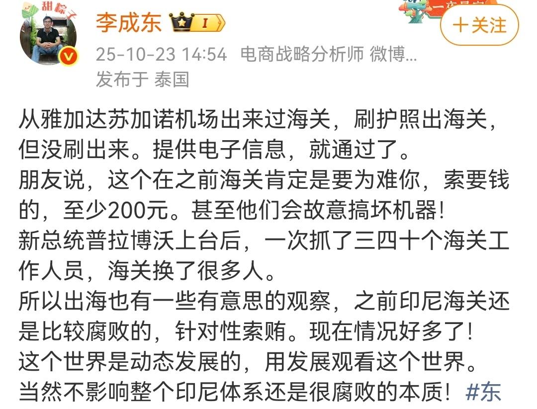 海关索贿的风险与机遇。 (图一)印尼政府出重拳,打击本国海关工作人员,对入境外国人索贿现象,有30多人被解职。 (图二,图三)针对有些国家海关人员索贿,有些在海外投资的国人提出了很新颖的看法,有索贿现象发生,就说明该国对基层控制力不足,就有很大的灰色暴富空间。 真是同一件事情,有人看是风险,有人看就是机遇。