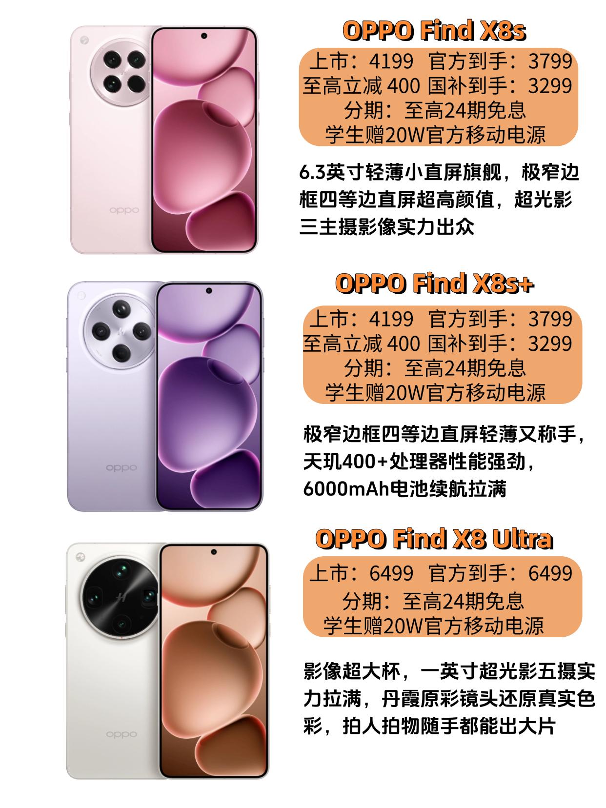 等等党大胜!OPPOFindX8系列双11好价大放送 双十一了,这阵子OPPO Find X8系列有好多🎁,之前忍住没买的终于可以下手了!! - 之前卖爆了的OPPO Find X8s,这几天的力度来了,官补+国补后到手3299起,小屏旗舰手感好,各方面配置也都是旗舰级别的。而且这个小手机屏幕边框巨窄,只有1.25mm,比iPhone 16 Pro max的1.3mm还窄,还是四等边框,不管是看起来还是握在手上都特别舒服。 - 喜欢大屏的也可以看看OPPO Find X8s+,屏幕更大电池更大,实测刷视频、5G 高刷用一整天,影像配置也很出众,哈苏算法 + 潜望长焦,虚化自然,随手拍出氛围感大片,到手3299也很香,和X8s一个价格,主要是看你喜欢大屏还是小屏了。 - 想要一步到位的也可以看看OPPO Find X8 Ultra,影像超大杯实力相当能打,一英寸主摄、潜望长焦、丹霞原彩镜头等等镜头配置拉满,随手一拍都能出大片!而且OPPO非常大胆在堆料这么足的手机做直屏,没想到手感还不错。 - OPPO对学生党还有额外关照,OPPO双十一活动期间学生党入手Find X8系列都有🎁20W官方移动电源,还有机会拿双十一限量学生礼包「欧气全包」,赶紧准备抄底购机吧!