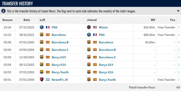 梅西职业生涯先后效力巴萨、巴黎以及迈阿密国际三家俱乐部,两次转会梅西均是自由身离队,无转会费。在梅西的德转页面中,他的生涯历史转会费总额赫然显示为0。