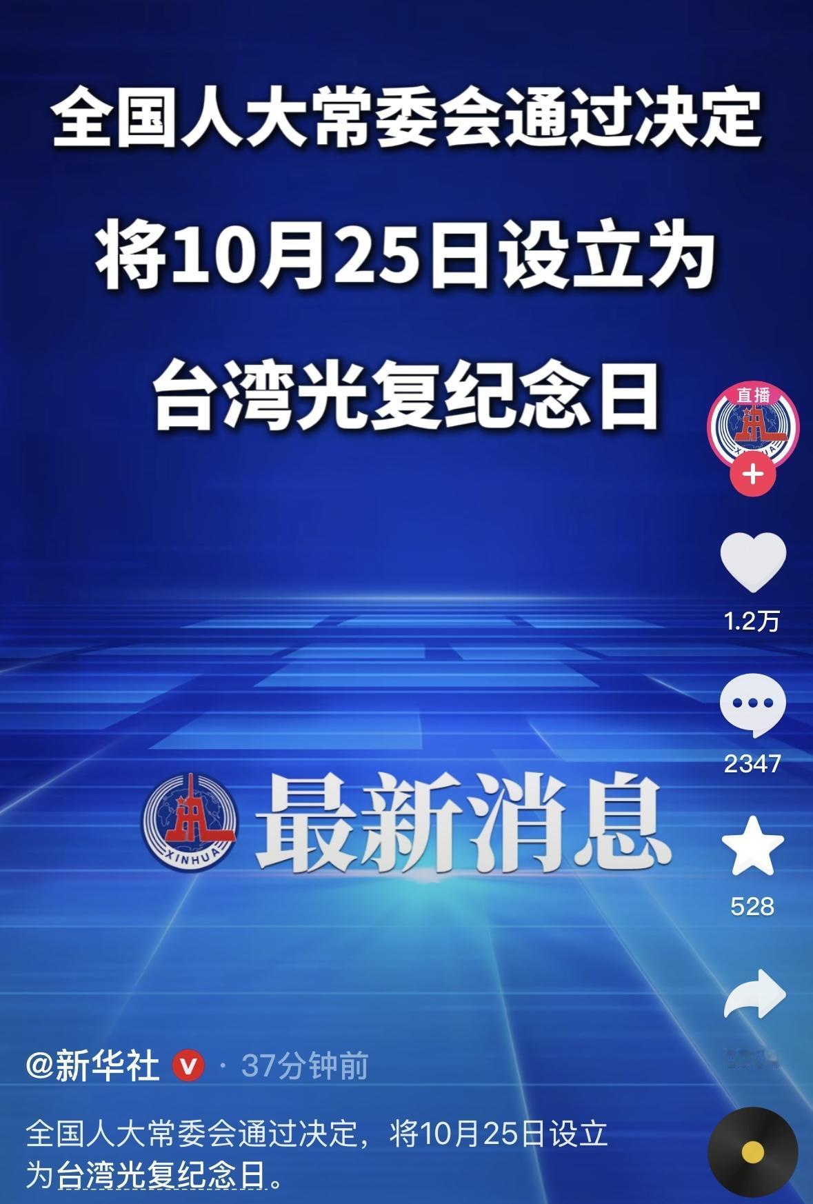 估计以后没有人再喊着收复台湾了,台湾已经收复80年了,怕你们忘记,更为了纪念,全国人大决定把0月25日作为台湾光复纪念日。昨天还有人喊着打打杀杀,要解放台湾,收复台湾,很多人都没有搞清楚台湾问题是怎么回事?对台湾历史几乎空白。好好学习吧!可能还有一些人,搞不明白,到底什么事情?