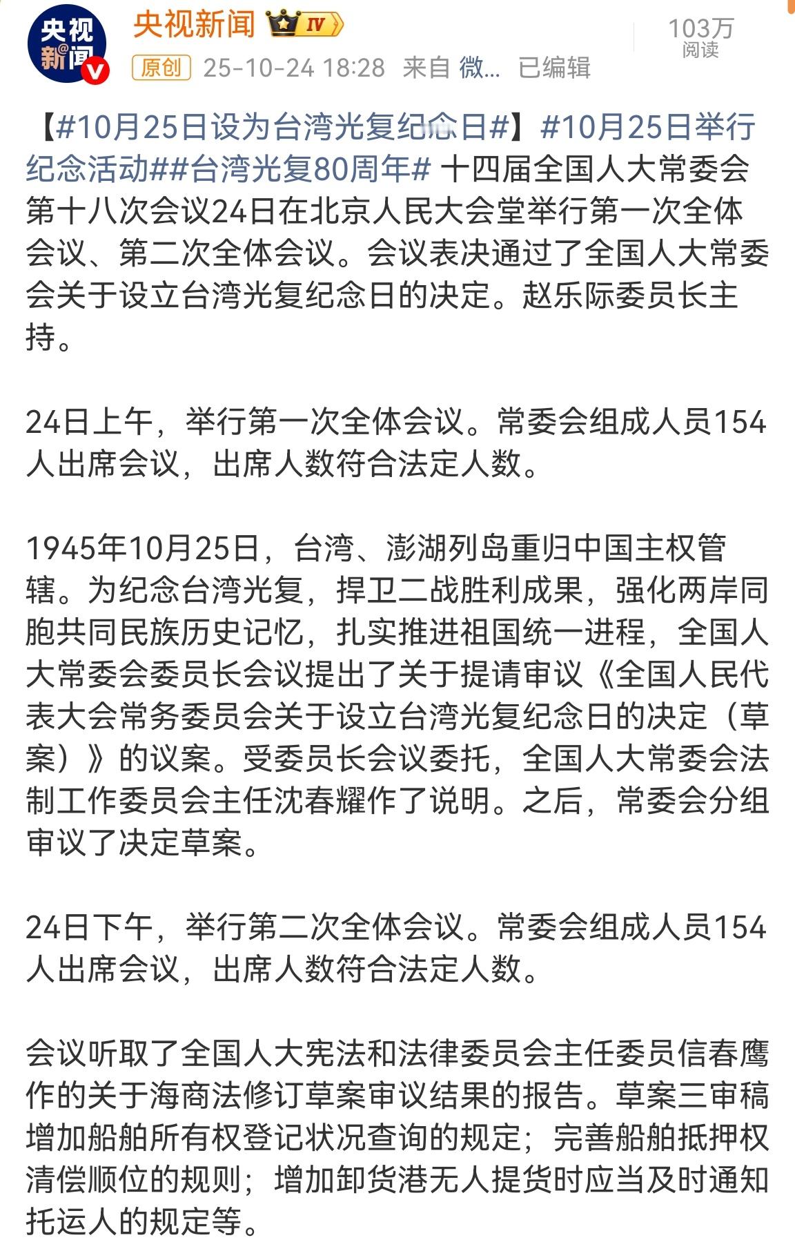 🔻期待台湾解放纪念日。10月25日设为台湾光复纪念日