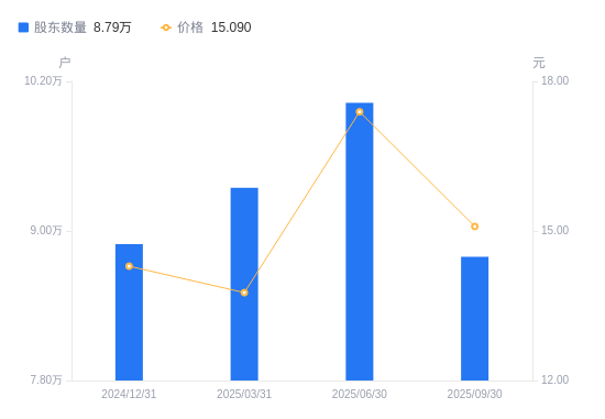 近一年(2024年9月30日至2025年9月30日),长亮科技A股股东户数从5.42万户,增加至8.79万户,增幅62.34%,区间股价上涨56.81%。