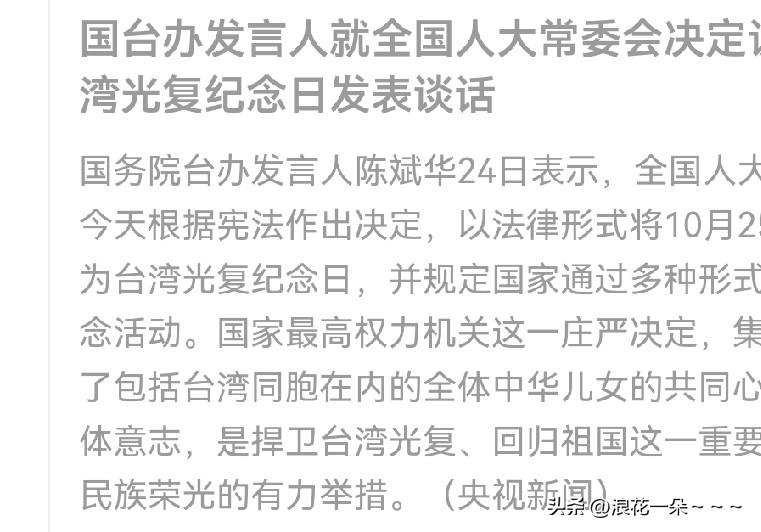 发现没有,朦朦胧胧的感到台湾回归的脚步越来越近了,刚刚看了央视新闻,又多了一个纪念日——台湾光复纪念日。 回想一下,我国有很多很多纪念日,比如说:澳门回归纪念日,抗美援朝纪念日,香港回归纪念日,中国人民抗日战争纪念日,西安事变纪念日…等等等等,意义都很重大! 这次把10月25日定为台湾光复纪念日,就是我们全体中华儿女共同期盼和愿望啊!大家记住了,就是明天啊。[玫瑰][比心]