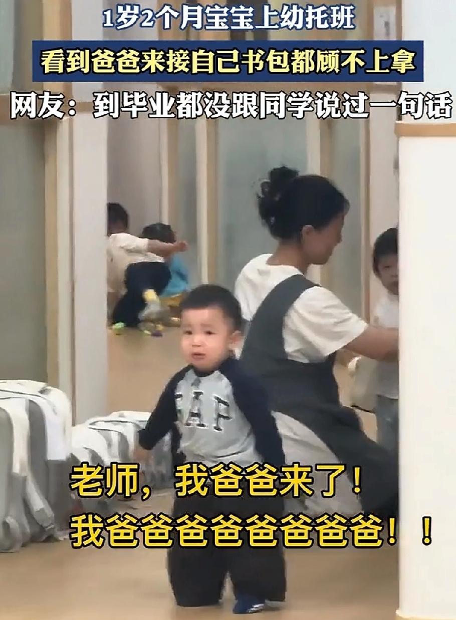 10月23日,广东一幼托所放学了,一岁两个月宝宝的心早已飞向了家。他把书包放在一边,让老师给他穿好衣服,等待家长来接他。 宝宝很守规矩,穿好衣服后,不敢离开老师的身边,老老实实的呆在一边。但是他的心早已不在幼托班了,两眼盯着门口,盼望家长能快点来。 宝爸终于出现在门口,宝宝顿时两眼放光。他兴奋的告诉老师,我爸爸来了。老师正在帮一个小女孩穿衣服,没空理他。宝宝顾不上那么多了,书包也顾不上拿,一路小跑扑向爸爸。 宝宝看到爸爸来接自己书包都顾不上拿人类幼崽