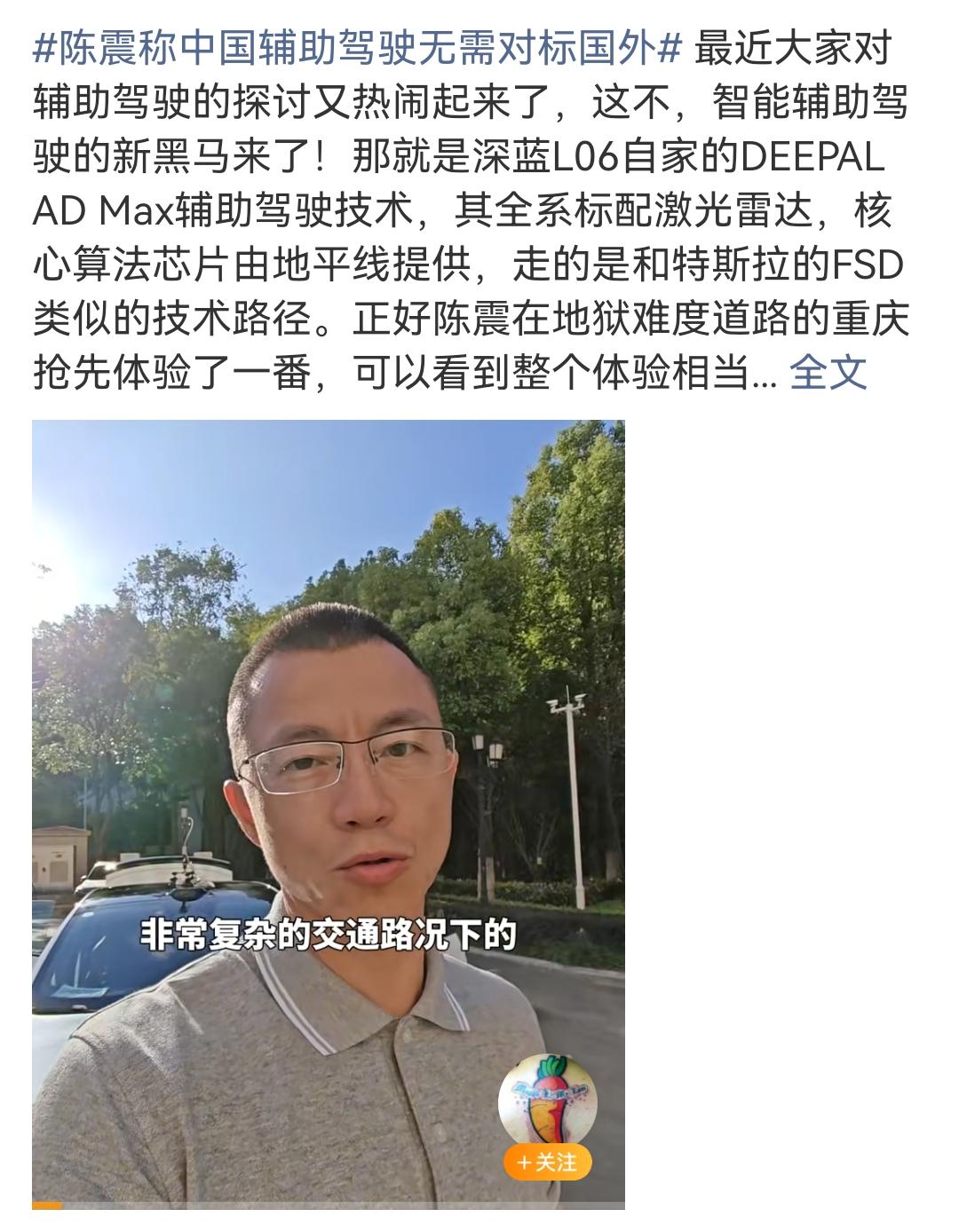 陈震称中国辅助驾驶无需对标国外! 陈震在重庆体验了深蓝L06的智能驾驶辅助表现,结果在重庆这么复杂的路况下,表现也非常的好。 陈震看来是被某国外品牌的智能驾驶辅助搞气到了,最近几天疯狂怼外国品牌的辅助驾驶。 各位是怎么看的?欢迎评论区留言。
