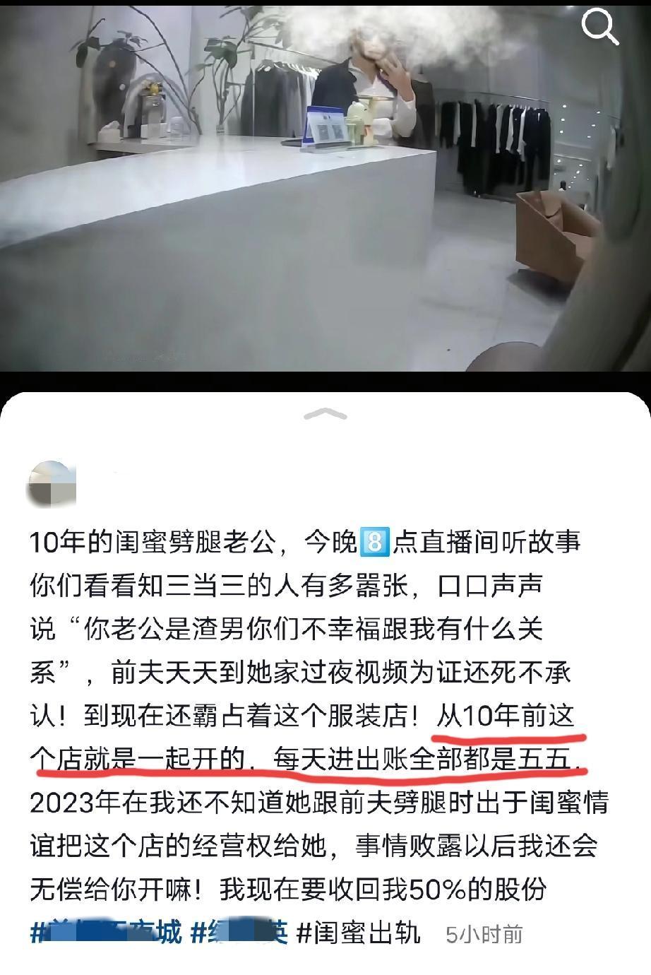 女子发视频曝光10年的闺蜜劈腿老公。且在直播间向网友讲述他们三个人之间的纠纠缠缠…… 据这个女的透露:她和闺蜜合伙开服装店,开了十年了,以前都是交于闺蜜经营,现在要把50%的股份要回来,而且她老公的店就在边上,经常走动…… 小编:我还是挺佩服这些女的,家里出了这等丑事,还好意思发到网上,还直播让大家吃瓜,没有其他目的我也不信的。我都怀疑她说的这些破事都是编出来的,就为了流量! 大家怎么看?