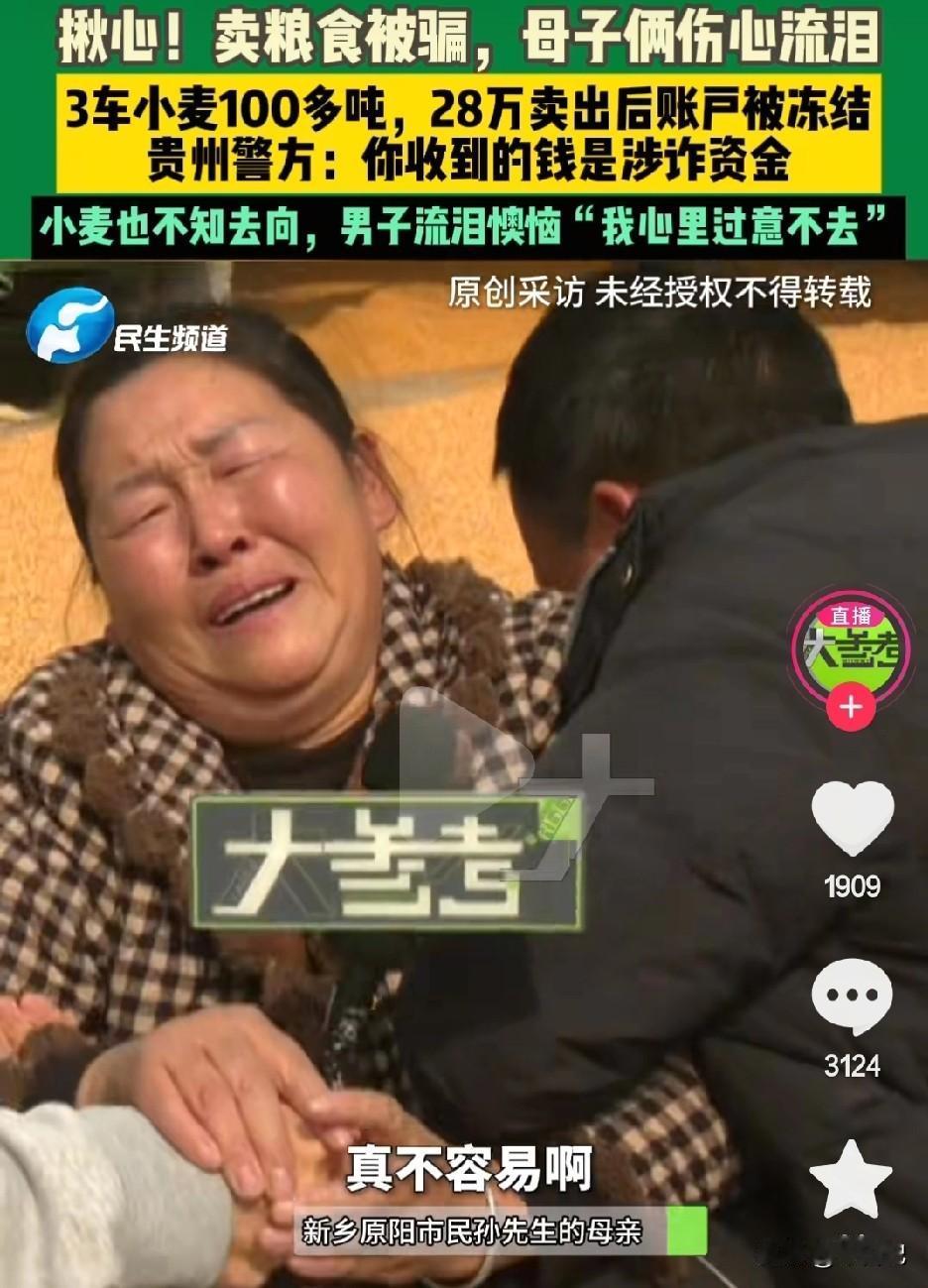 100多吨小麦卖28万, 已到账就冻结。 太过分了, 本来不挣钱,还给冻结了。 母子卖粮食, 结果涉嫌成为诈骗资金,不能取。 骗子抓不到, ……