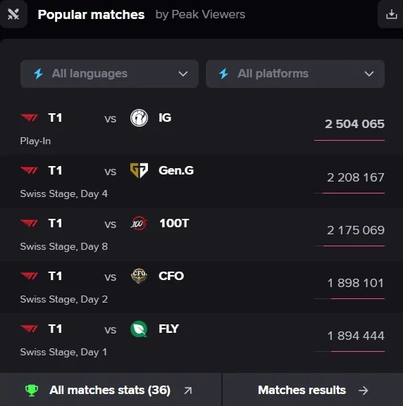 值得一提的是,T1目前只在S15全球总决赛上进行过五场比赛,占据海外峰值前五。