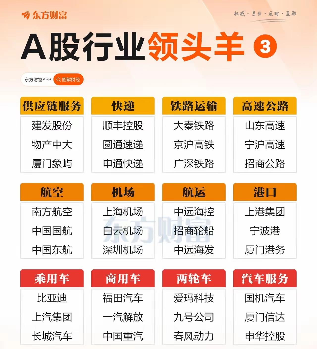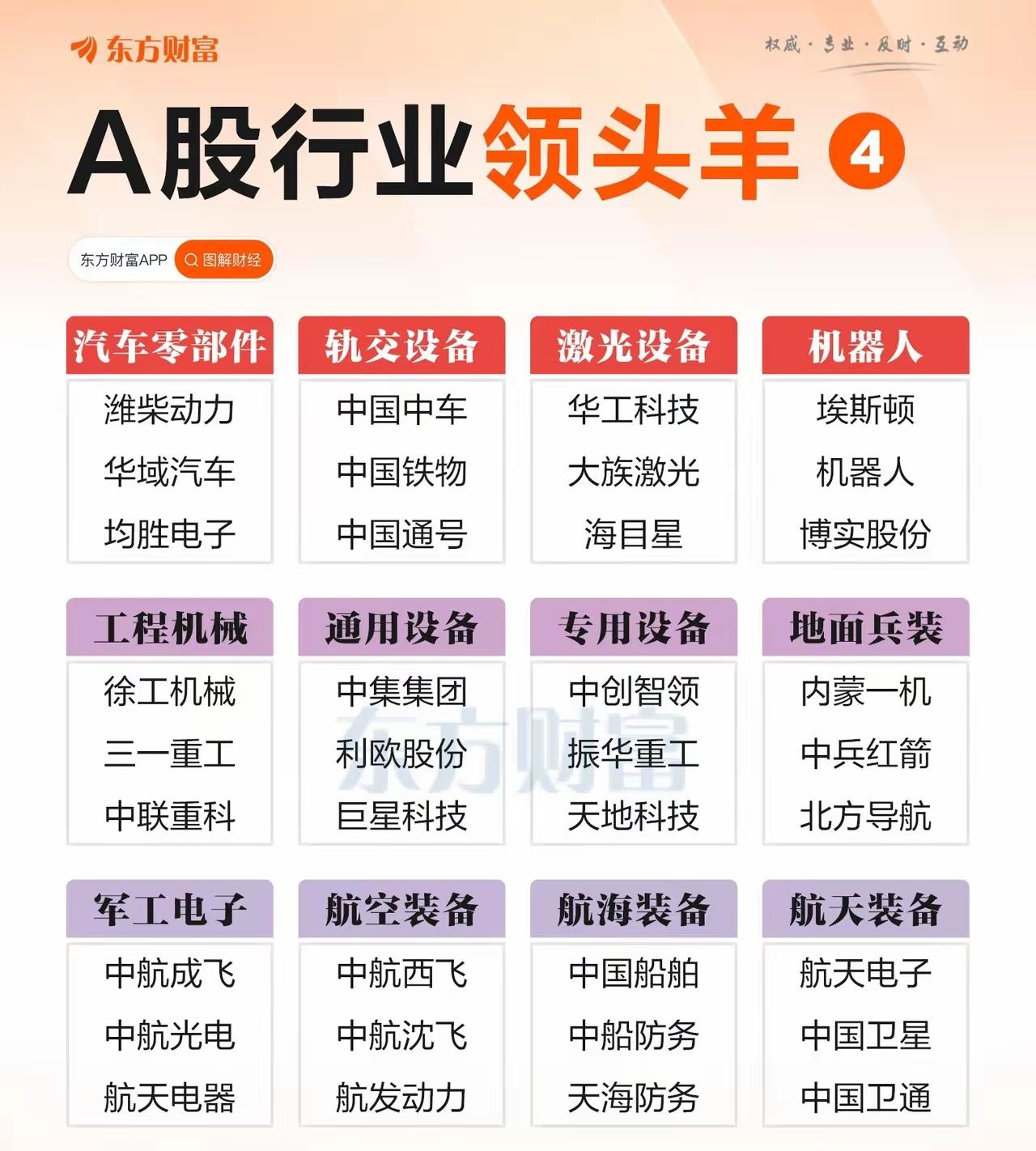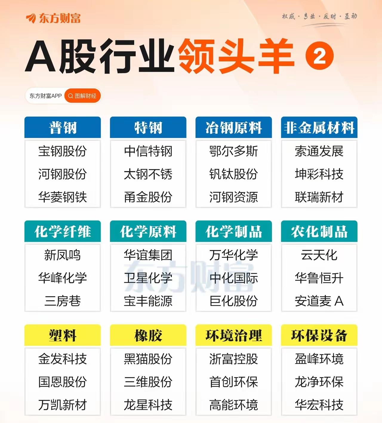 第一波“A股行业领头羊”企业。 “A股行业领头羊1”,介绍了煤炭(如中国神华、陕西煤业、中煤能源)、焦炭(如美锦能源、陕西黑猫、山西焦化)、炼化及贸易(如中国石油、中国石化、荣盛石化)、油气开采(如*ST新潮、蓝焰控股)、油服工程(如石化油服、中油工程、中海油服)、贵金属(如山东黄金、恒邦股份、中金黄金)、小金属(如贵研铂业、锡业股份、厦门钨业)、金属新材料(如博威合金、江南新材、安泰科技)、工业金属(如江西铜业、紫金矿业、中国铝业)、能源金属(如华友钴业、盛屯矿业、赣锋锂业)以及电力(如华能国际、国电电力、华电国际)、燃气(如新奥股份、深圳燃气、佛燃能源)等多个能源与资源类行业的龙头公司。 “A股行业领头羊2”,展示了普钢(如宝钢股份、河钢股份、华菱钢铁)、特钢(如中信特钢、太钢不锈、甬金股份)、冶钢原料(如鄂尔多斯、钒钛股份、河钢资源)、非金属材料(如索通发展、坤彩科技、联瑞新材)、化学纤维(如新凤鸣、华峰化学、三房巷)、化学原料(如华谊集团、卫星化学、宝丰能源)、化学制品(如万华化学、中化国际、巨化股份)、农化制品(如云天化、华鲁恒升、安道麦A)、塑料(如金发科技、国恩股份、万凯新材)、橡胶(如黑猫股份、三维股份、龙星科技)以及环境治理(如浙富控股、首创环保、高能环境)、环保设备(如盈峰环境、龙净环保、华宏科技)等材料与化工、环保类行业的代表企业。 “A股行业领头羊3”,聚焦交通运输与汽车相关领域,包括供应链服务(如建发股份、物产中大、厦门象屿)、快递(如顺丰控股、圆通速递、申通快递)、铁路运输(如大秦铁路、京沪高铁、广深铁路)、高速公路(如山东高速、宁沪高速、招商公路)、航空(如南方航空、中国国航、中国东航)、机场(如上海机场、白云机场、深圳机场)、航运(如中远海控、招商轮船、中远海发)、港口(如上港集团、宁波港、厦门港务),以及乘用车(如比亚迪、上汽集团、长城汽车)、商用车(如福田汽车、一汽解放、中国重汽、爱玛科技、九号公司、春风动力)、两轮车(如国机汽车、厦门信达、申华控股)和汽车服务相关行业的龙头企业。 “A股行业领头羊4”,涵盖高端制造与国防军工领域,包括汽车零部件(如潍柴动力、华域汽车、均胜电子)、轨交设备(如中国中铁物、中国通号)、激光设备(如华工科技、大族激光、海目星)、机器人(如埃斯顿、博实股份)、工程机械(如徐工机械、三一重工、中联重科)、通用设备(如中集集团、利欧股份、巨星科技)、专用设备(如中创智领、振华重工、天地科技)、地面兵装(如内蒙一机、中兵红箭、北方导航)、军工电子(如中航成飞、中航光电、航天电器)、航空装备(如中航西飞、中航沈飞、航发动力)、航海装备(如中国船舶、中船防务、天海防务)、航天装备(如航天电子、中国卫星、中国卫通)等行业的代表公司。 “A股行业领头羊5”,重点展示建筑材料与工程建设相关行业,包括装修建材(如东方雨虹、北新建材、三棵树)、水泥(如金隅集团、海螺水泥、天山股份)、玻璃玻纤(如中材科技、中国巨石、旗滨集团)、工程咨询(如太极实业、中交设计、建发合诚)、房屋建设(如中国建筑、上海建工、陕建股份)、装修装饰(如金螳螂、江河集团、亚厦股份)、基建市政(如中国中铁、中国铁建、中国交建)、园林工程(如棕榈股份、蒙草生态、普邦股份)、专业工程(如中国中冶、深桑达A、中铝国际)、钢结构(如鸿路钢构、精工钢构、宏盛华源)、化学工程(如中国化学、东华科技、利柏特)、国际工程(如中材国际、中钢国际、北方国际)等细分领域的龙头上市公司。 “A股行业领头羊6”,涉及房地产与金融服务领域,包括房地产开发(如保利发展、万科A、绿地控股)、房地产服务(如招商积余、我爱我家、新大正)、国有银行(如工商银行、建设银行、农业银行)、股份制银行与城商行(如江苏银行、宁波银行)、农商行(如渝农商行、沪农商行、常熟银行)、保险(如中国平安、中国人保、中国人寿)、证券(如中信证券、国泰海通、华泰证券)、金融控股(如中油资本、越秀资本、中粮资本)、期货(如永安期货、南华期货、瑞达期货)、信托(如国网英大、陕国投A、建元信托)、租赁(如渤海租赁、江苏金租、海南华铁)等金融与地产类行业的主要企业。 “A股行业领头羊7”,介绍农林牧渔与轻工业相关行业,其中农林牧渔类(用红色框标注)包括种植业(如海南橡胶、苏垦农发、诺普信)、林业(如平潭发展、永安林业、ST景谷)、养殖业(如牧原股份、新希望、温氏股份、中水渔业、国联水产、开创国际)、渔业、农产品加工(如金龙鱼、中粮糖业、中粮科技)、饲料(如海大集团、禾丰股份、大北农)、动物保健(如中牧股份、瑞普生物、金河生物)、农业综合(如辉隆股份、大禹节水、润农节水);轻工业类(用紫色框标注)包括造纸(如太阳纸业、山鹰国际、博汇纸业)