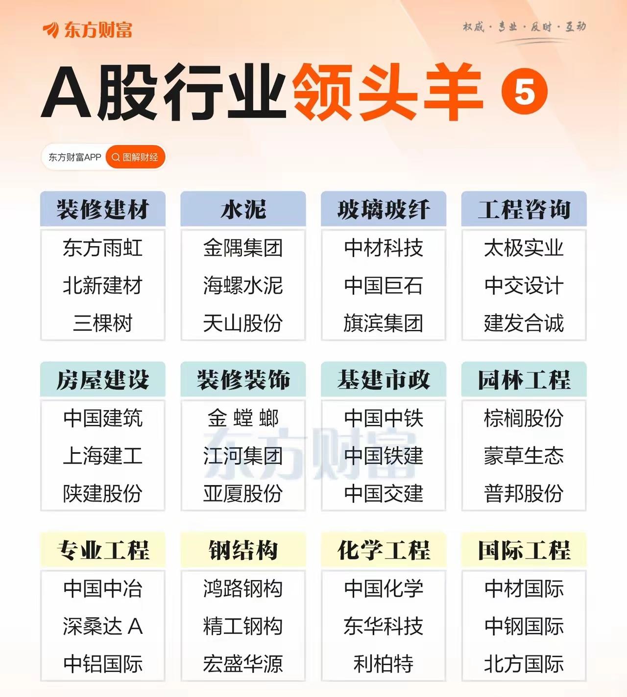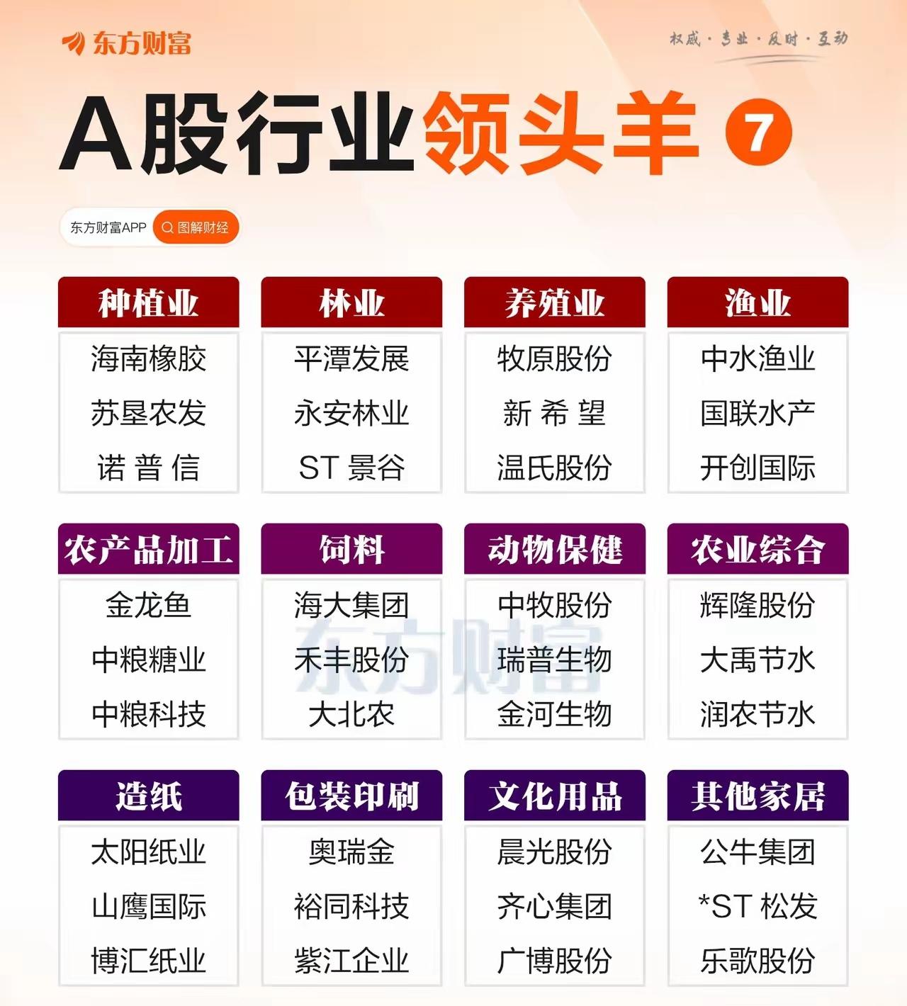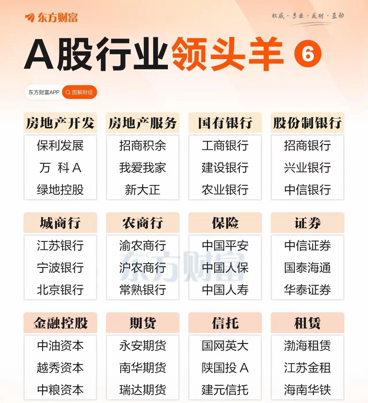 第一波“A股行业领头羊”企业。 “A股行业领头羊1”,介绍了煤炭(如中国神华、陕西煤业、中煤能源)、焦炭(如美锦能源、陕西黑猫、山西焦化)、炼化及贸易(如中国石油、中国石化、荣盛石化)、油气开采(如*ST新潮、蓝焰控股)、油服工程(如石化油服、中油工程、中海油服)、贵金属(如山东黄金、恒邦股份、中金黄金)、小金属(如贵研铂业、锡业股份、厦门钨业)、金属新材料(如博威合金、江南新材、安泰科技)、工业金属(如江西铜业、紫金矿业、中国铝业)、能源金属(如华友钴业、盛屯矿业、赣锋锂业)以及电力(如华能国际、国电电力、华电国际)、燃气(如新奥股份、深圳燃气、佛燃能源)等多个能源与资源类行业的龙头公司。 “A股行业领头羊2”,展示了普钢(如宝钢股份、河钢股份、华菱钢铁)、特钢(如中信特钢、太钢不锈、甬金股份)、冶钢原料(如鄂尔多斯、钒钛股份、河钢资源)、非金属材料(如索通发展、坤彩科技、联瑞新材)、化学纤维(如新凤鸣、华峰化学、三房巷)、化学原料(如华谊集团、卫星化学、宝丰能源)、化学制品(如万华化学、中化国际、巨化股份)、农化制品(如云天化、华鲁恒升、安道麦A)、塑料(如金发科技、国恩股份、万凯新材)、橡胶(如黑猫股份、三维股份、龙星科技)以及环境治理(如浙富控股、首创环保、高能环境)、环保设备(如盈峰环境、龙净环保、华宏科技)等材料与化工、环保类行业的代表企业。 “A股行业领头羊3”,聚焦交通运输与汽车相关领域,包括供应链服务(如建发股份、物产中大、厦门象屿)、快递(如顺丰控股、圆通速递、申通快递)、铁路运输(如大秦铁路、京沪高铁、广深铁路)、高速公路(如山东高速、宁沪高速、招商公路)、航空(如南方航空、中国国航、中国东航)、机场(如上海机场、白云机场、深圳机场)、航运(如中远海控、招商轮船、中远海发)、港口(如上港集团、宁波港、厦门港务),以及乘用车(如比亚迪、上汽集团、长城汽车)、商用车(如福田汽车、一汽解放、中国重汽、爱玛科技、九号公司、春风动力)、两轮车(如国机汽车、厦门信达、申华控股)和汽车服务相关行业的龙头企业。 “A股行业领头羊4”,涵盖高端制造与国防军工领域,包括汽车零部件(如潍柴动力、华域汽车、均胜电子)、轨交设备(如中国中铁物、中国通号)、激光设备(如华工科技、大族激光、海目星)、机器人(如埃斯顿、博实股份)、工程机械(如徐工机械、三一重工、中联重科)、通用设备(如中集集团、利欧股份、巨星科技)、专用设备(如中创智领、振华重工、天地科技)、地面兵装(如内蒙一机、中兵红箭、北方导航)、军工电子(如中航成飞、中航光电、航天电器)、航空装备(如中航西飞、中航沈飞、航发动力)、航海装备(如中国船舶、中船防务、天海防务)、航天装备(如航天电子、中国卫星、中国卫通)等行业的代表公司。 “A股行业领头羊5”,重点展示建筑材料与工程建设相关行业,包括装修建材(如东方雨虹、北新建材、三棵树)、水泥(如金隅集团、海螺水泥、天山股份)、玻璃玻纤(如中材科技、中国巨石、旗滨集团)、工程咨询(如太极实业、中交设计、建发合诚)、房屋建设(如中国建筑、上海建工、陕建股份)、装修装饰(如金螳螂、江河集团、亚厦股份)、基建市政(如中国中铁、中国铁建、中国交建)、园林工程(如棕榈股份、蒙草生态、普邦股份)、专业工程(如中国中冶、深桑达A、中铝国际)、钢结构(如鸿路钢构、精工钢构、宏盛华源)、化学工程(如中国化学、东华科技、利柏特)、国际工程(如中材国际、中钢国际、北方国际)等细分领域的龙头上市公司。 “A股行业领头羊6”,涉及房地产与金融服务领域,包括房地产开发(如保利发展、万科A、绿地控股)、房地产服务(如招商积余、我爱我家、新大正)、国有银行(如工商银行、建设银行、农业银行)、股份制银行与城商行(如江苏银行、宁波银行)、农商行(如渝农商行、沪农商行、常熟银行)、保险(如中国平安、中国人保、中国人寿)、证券(如中信证券、国泰海通、华泰证券)、金融控股(如中油资本、越秀资本、中粮资本)、期货(如永安期货、南华期货、瑞达期货)、信托(如国网英大、陕国投A、建元信托)、租赁(如渤海租赁、江苏金租、海南华铁)等金融与地产类行业的主要企业。 “A股行业领头羊7”,介绍农林牧渔与轻工业相关行业,其中农林牧渔类(用红色框标注)包括种植业(如海南橡胶、苏垦农发、诺普信)、林业(如平潭发展、永安林业、ST景谷)、养殖业(如牧原股份、新希望、温氏股份、中水渔业、国联水产、开创国际)、渔业、农产品加工(如金龙鱼、中粮糖业、中粮科技)、饲料(如海大集团、禾丰股份、大北农)、动物保健(如中牧股份、瑞普生物、金河生物)、农业综合(如辉隆股份、大禹节水、润农节水);轻工业类(用紫色框标注)包括造纸(如太阳纸业、山鹰国际、博汇纸业)