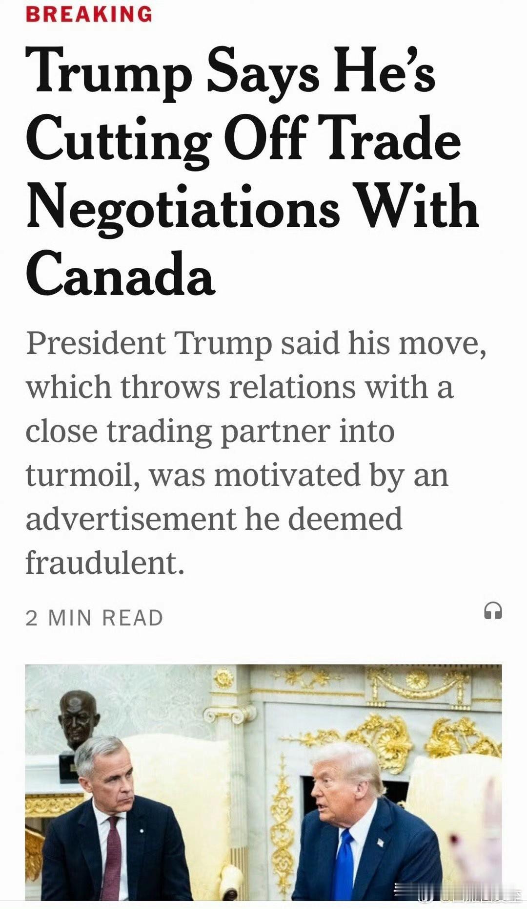 请看配图—— Trump宣布:终止与加拿大的一切贸易谈判 起因:加拿大在美国做广