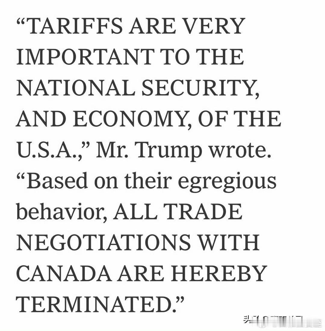 请看配图—— Trump宣布:终止与加拿大的一切贸易谈判 起因:加拿大在美国做广告,向民众宣传关税的坏处,广告里引用了里根讲话“关税不利于经济”。 Trump大怒:关税对国家安全和美国经济,非常重要❗️不谈了❗️ ​​​ 图2和图3证明该信息属实。 其实,特朗普对加拿大恼火的还不止这些,起因是近期以来加拿大与美国渐行渐远,不再依赖美国,把目光转向东方。 卡尼政府正通过一系列高层互动和政策调整,将战略转向付诸行动: * 高层外交互动:加拿大外长阿南德于10月中旬访问了印度、新加坡和中国。这是她上任后首次访华,意在为加中关系带来更多稳定性。同时,加拿大总理卡尼正寻求在APEC峰会期间与中国领导人会晤。 * 关键政策调整:加拿大财政部于10月15日生效了一项修正案,减免了部分从中国进口的钢铁和铝产品的关税。此举被视为向中国释放的缓和信号。 *推动国内基建:卡尼政府将蒙特利尔港扩建等基础设施列为国家重点项目,旨在加强加拿大与欧洲、中东及南亚的贸易联系,减少通过美国港口的转口依赖。 卡尼多次表达减少对美国的依赖,加拿大民众对特朗普把加拿大变成美国的一个省极为反感,减少对美国的依从,深得人心。 综上所述,加拿大政府近期的一系列正常作为,惹恼特朗普,但又无法干涉,找个因由借题发挥,表达不满罢了。