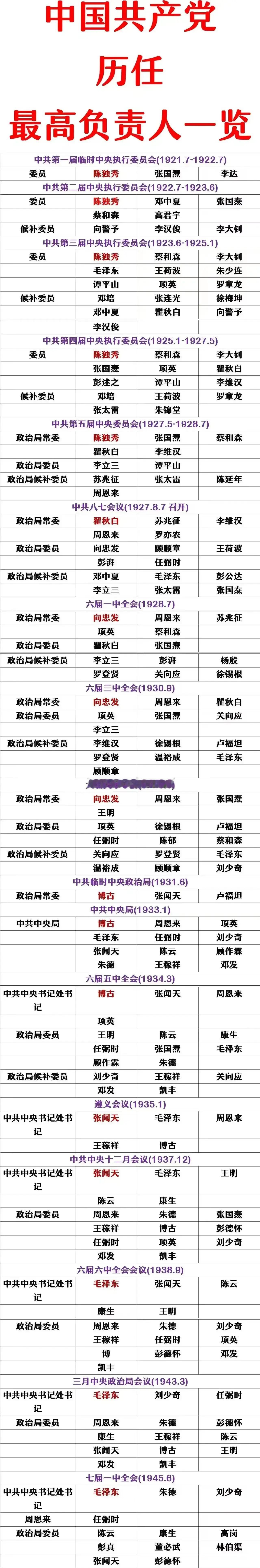 我党历任负责人一览。 南陈北李,相约建党,陈独秀在我党最初始的地位非常高。 而我党在不断探索的过程中,换了很多人掌舵,无论是陈独秀、瞿秋白、张闻天,他们都呕心沥血,立下了自己的功劳。 但是真正能带领我党从胜利走向更大胜利的人,只能是毛主席。在这个过程中,王稼祥是伯乐。 遵义会议时,王稼祥投了最为关键的一票。 他不仅是毛主席军事路线的最早支持者,更是推动毛主席领导地位确立的关键核心人物。