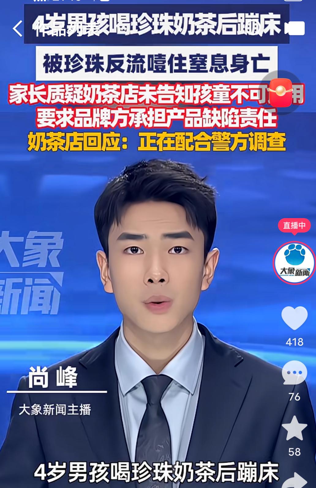 太不幸了!浙江台州,一4岁男孩,在喝完珍珠奶茶后,去玩蹦床,谁知竟引起珍珠反流,噎住气道身亡。 事后,孩子家长向奶茶店提出质疑,认为这种奶茶不适合儿童饮用,而商家并未明确告知,所以要求品牌方承担相应的责任。 就本事件来说,品牌方有没有责任先放到一边,身为家长,做为孩子第一監护人,肯定有不可推卸的责任! 假如说孩子没有吃珍珠奶茶,吃的是糖葫芦,在吃的时候跌倒了,竹签正好刺穿了喉咙,难道你还要告卖糖葫芦小贩,没有明确说明吗? 另外,我们当家长的,带孩子时,应该学一些医学常识,以备不测发生。就比如此案中,发现孩子被东西噎住了,如果立刻采用海姆立克急救法。或许,悲剧就能够避免。