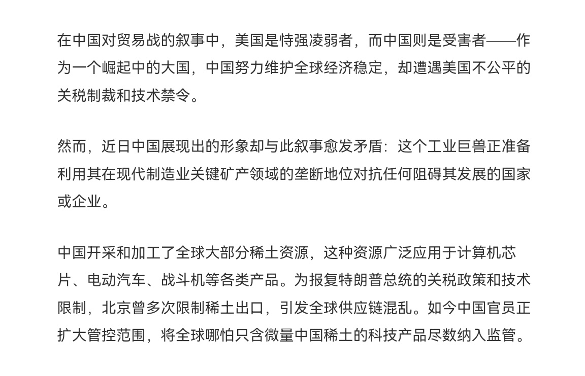 🔻笑死我了纽约时报,说🇨🇳的稀土长臂管辖新规定会让🇨🇳变成其经常指责的霸权主义国家。