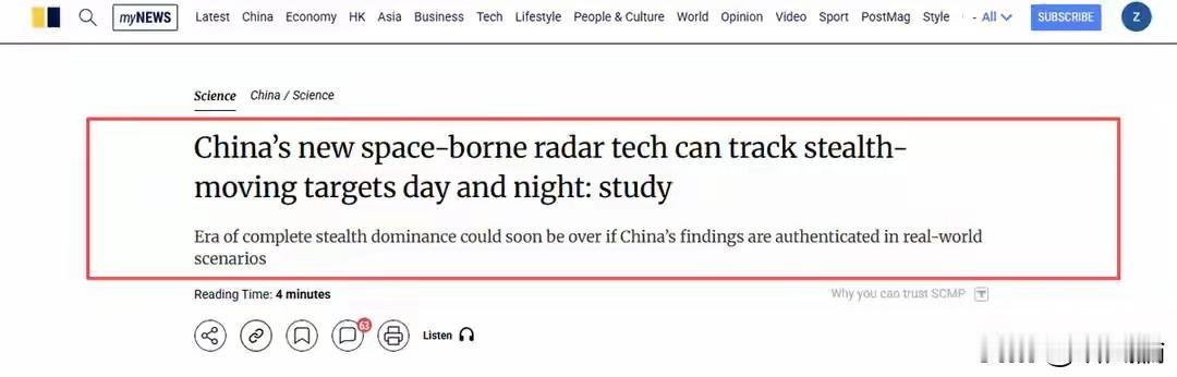 中国卫星雷达要叫美国隐身战机没处藏咧!港媒说 10月16日,香港《南华早报》报道咧,说中国上海航天技术研究院领头的团队,正模拟一个卫星载的新雷达系统。这系统要成了,就能24小时不停跟踪美国嘞隐身战机,像F-22、F-35和B-21,叫它们藏不住。 咋弄嘞?用的是双基雷达,就是把雷达嘞发射和接收分开,放两个卫星上。一个卫星发信号,另一个收信号,俩卫星夹角30到130度。从太空往下看,隐身战机嘞雷达反射面积能超过10平方米,比卡车还大,所以五代机也没用。 过去为啥没国家弄?一是卫星发射贵,动不动几亿美元;二是技术不行,分不清背景杂波。现在中国商业航天成熟咧,成本降下来咧。团队开发了新模型,能用数字信号处理掉杂波。比如2024年,中国“吉林1号”卫星就用光学成像拍到云里嘞F-22,但光学看天吃饭,所以改雷达补上夜间和坏天气嘞缺。 中国计划把卫星放两种轨道:低轨道(500-1000公里高)和同步轨道。低轨道扫描快,同步轨道盯得久。2023年,中国就发射过LT-1双基卫星,证明技术成熟咧。组网后,就算部分卫星坏咧,系统照样转。 这系统能给中国开“全地图透视”,帮东风导弹打目标。外媒说,中国军费投15%到太空,要建天、空、地三基探测网。美国在这方面落后咧,亚太嘞隐身战机以后难藏身。反隐身雷达技术 雷达导弹 中国雷达 美国雷达 中美隐身战机 光子雷达 雷达概念 反隐身雷达技术 战略雷达 雷达导弹 中国雷达 美国雷达 中美隐身战机 雷达电子侦察机