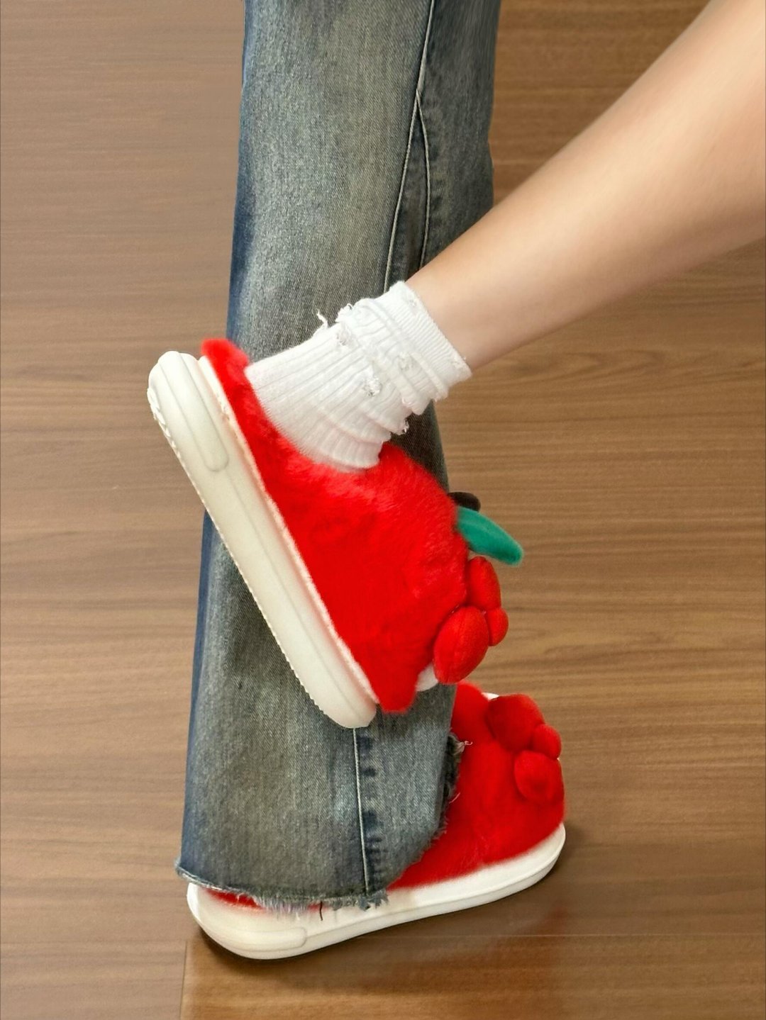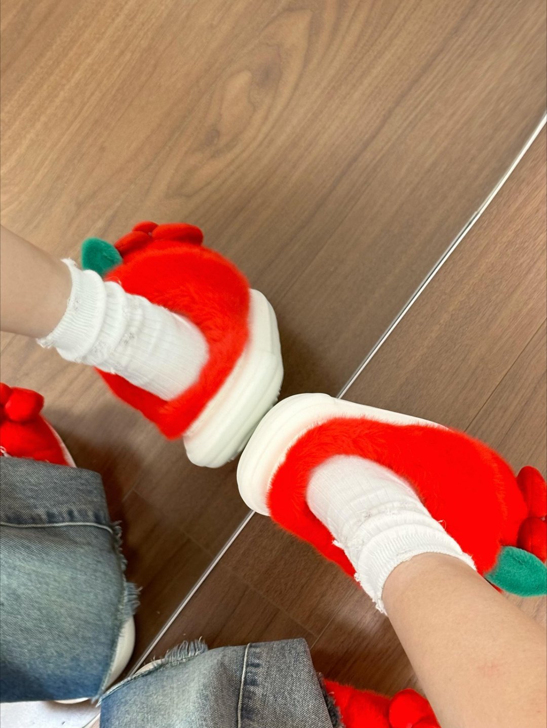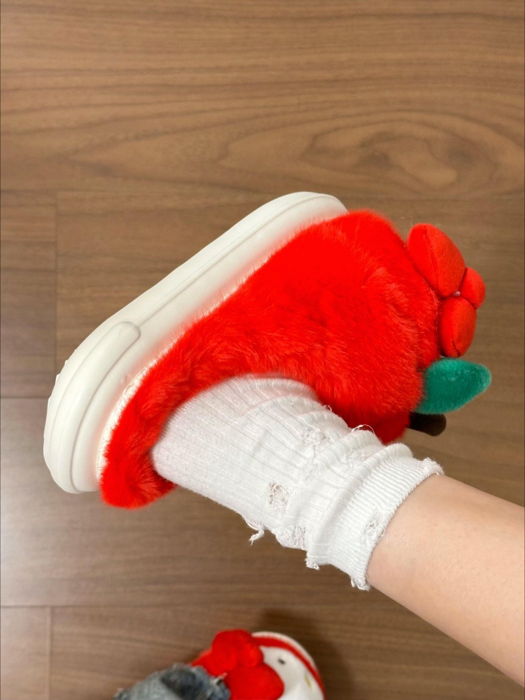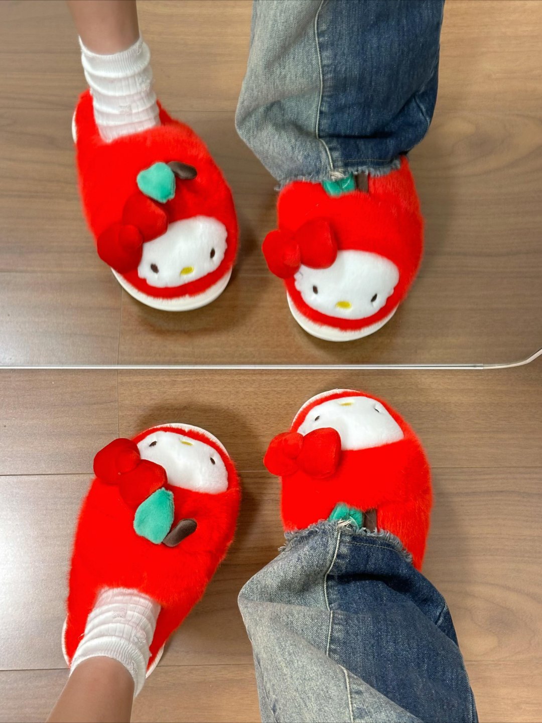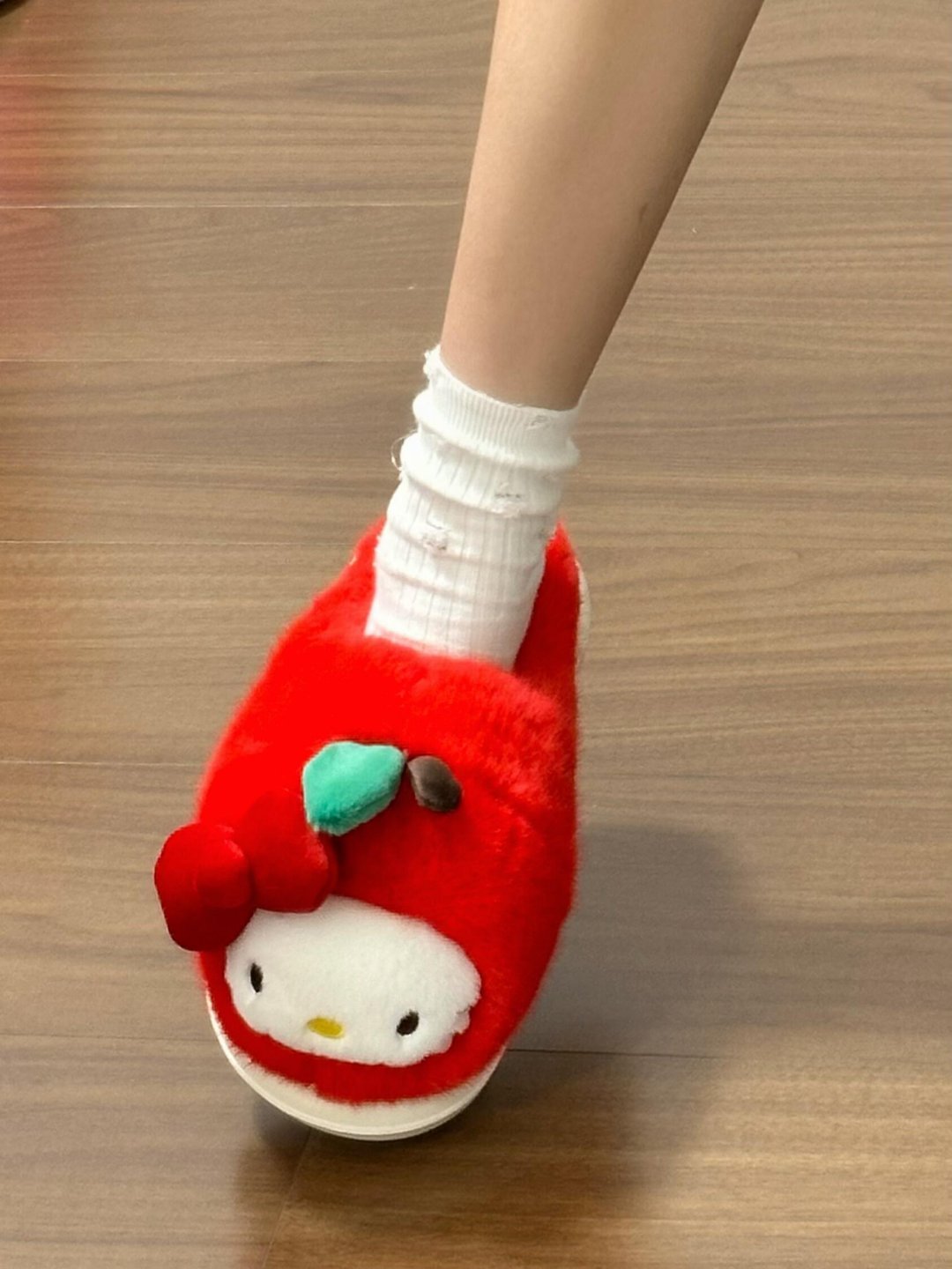 挖到这双红苹果造型的Hello Kitty棉拖真的戳中我,整只鞋是软乎乎的毛绒材质,裹上脚暖得像踩进云朵里,冬天光脚穿都不冻脚。