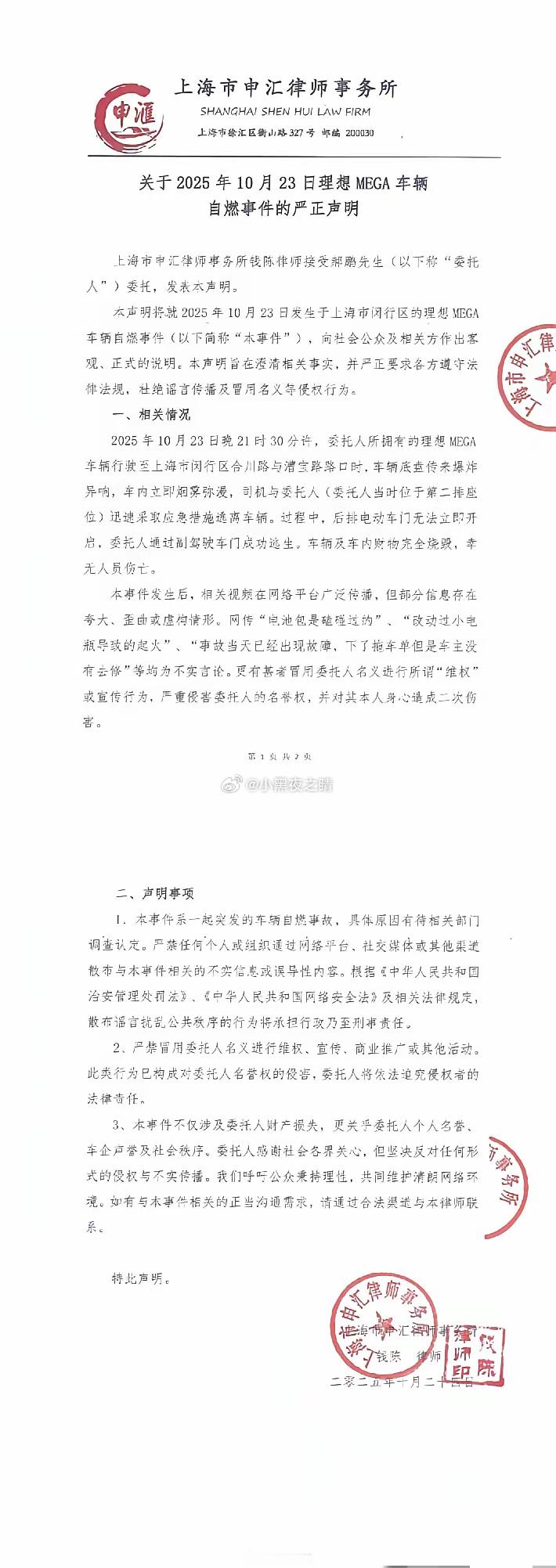 结果这些传言被起火的MEGA车主看到了,立刻联系律师事务所,出则了一条严正申明,不得不说,效率方面还得是沪爷。亮点很多:第一,车辆自燃时后排车门无法立即开启,委托人通过副驾驶车门成功逃生。第二,网传电池包磕碰过和改动小电池是谣言。第三,网传事故当天已经出现故障,下了拖车单,但是车主没有去修也是谣言。