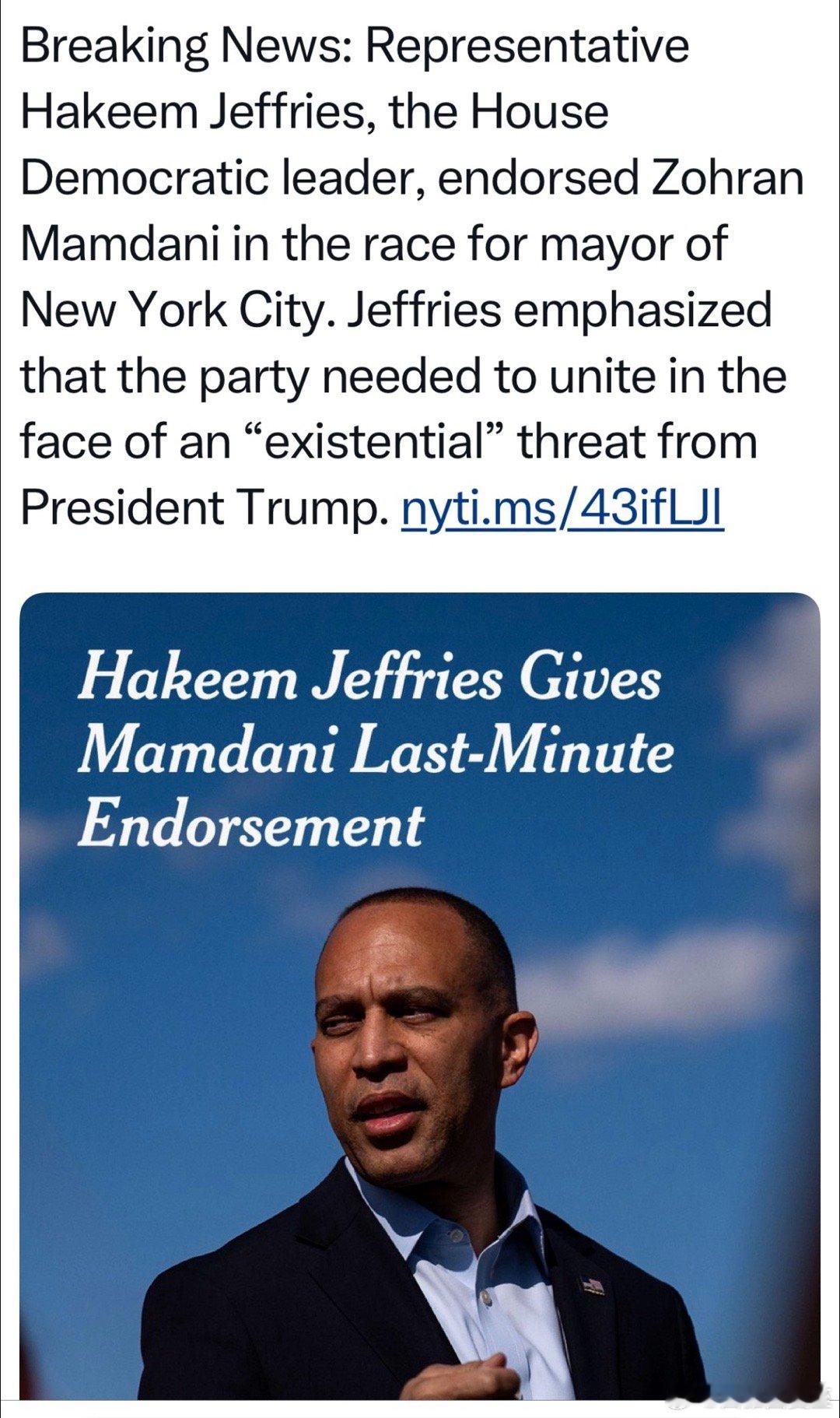 民主党众议院领袖正式背书民主党纽约市长候选人:我尊重选民、尤其是年轻人的意愿,Mamdani竞选纲领是改善民生、降低物价,要给他机会…我们必须团结,反抗以Trump为首的共和党带来的真正威胁