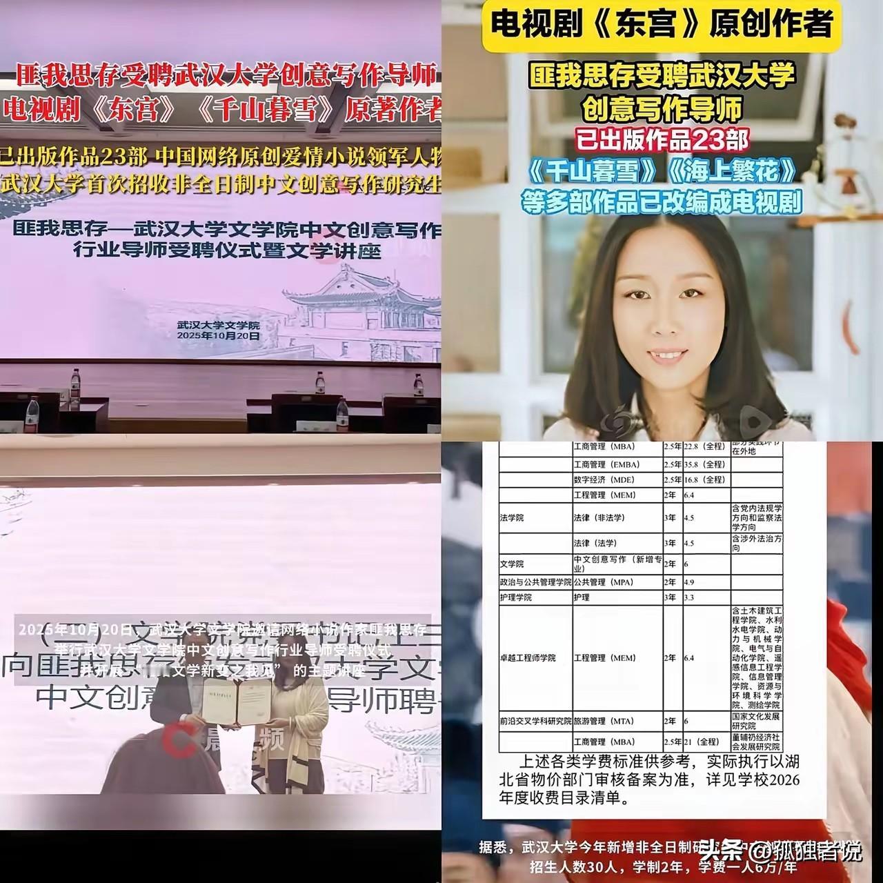 武汉大学的含金量进一步下降!日前,武汉大学聘请网文作家“匪我思存”担任文学院导师,这位湖北籍才女出版了23部作品,其代表作《东宫》、《千山暮雪》和《佳梦如期》等被改编成多部热播影视剧,可称得上是国内有一定知名度的网文作家。 但是,一所国内知名大学聘请网文作家担任导师这事确实不妥!大学要培养的不是一群可以写网文的作家,那些只是流量的投机者。为了迎合读者的喜好和猎奇心理,这些网文作家已经失去了写作的初心,他们写作的目的只是为了赚钱而已! 现在国内的文学已死!一些知名作家不好好写作了,反而热衷于参加各类综艺节目,有的人为了卖书,去网红的直播捧网红的臭脚,那种互相恭维的神态让人看了真的很厌恶!当作家们已经没有了文人风骨,何谈能写出惊世骇俗的作品! 确实,在如今流量为王的时代,整个社会价值观已经被带偏了,大多数人都装到钱眼里了,不仅是作家们,其他领域的很多人也是,比如演员们也不好好拍戏了,因为直播带货赚到的钱比拍戏来得容易多了。 作家们也一样,他们参加综艺节目或者在网红直播间卖书能赚到的钱也比他们埋头写作可以赚到的多地多。最终的结果是,现在作家们的作品已经变得千篇一律了,没有了思考,没有了深度,更没有了社会责任! 文学已死!一批投机者却诞生了!武汉大学已经开创了先河,下一个被带偏的行业是什么!