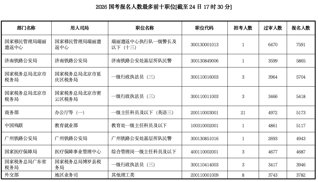 【#国考报名人数超350万创新高# 】#国考前十岗位3个为税务系统# 10月24日18时,2026年国考报名入口正式关闭。据中公教育统计,截至24日17时30分,2026国考报名总人数达3515251人,与去年同期相比增加近26万人,刷新历史新高,其中3207060人已通过招录单位审核,拿到2026国考“入场券”。#国考最热岗位7591人争1岗#