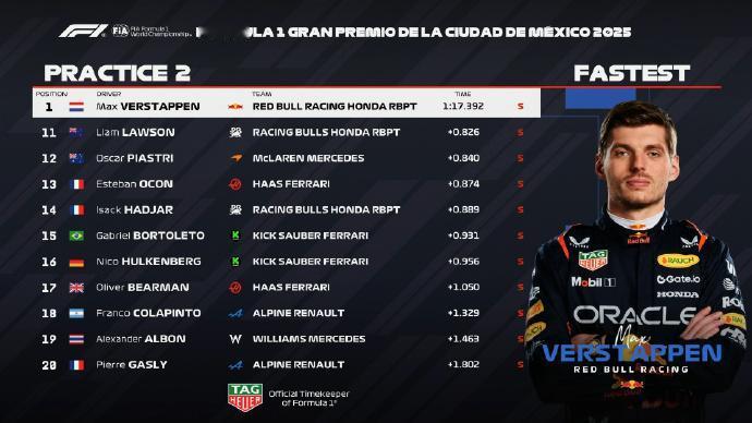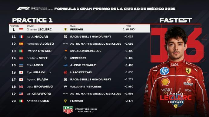 赛车:2025F1墨西哥城大奖赛一练二练成绩! 一练: 勒克莱尔以1:18.38