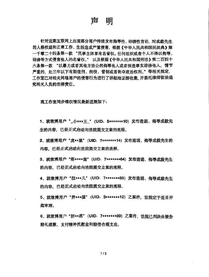 【#成毅工作室同步维权进展#】#成毅方将维权坚持到底# 10月24日,发布严正声明:针对近期互联网上出现部分用户持续发布侮辱性、诽谤性言论,对成毅先生的人格权益和正常工作、生活造成严重侵害。工作室已对相关网络用户的侵害行为进行了详细地证据收集,并委托律师依法追究相关人员的法律责任。并同步维权情况最新进展。#成毅[超话]#