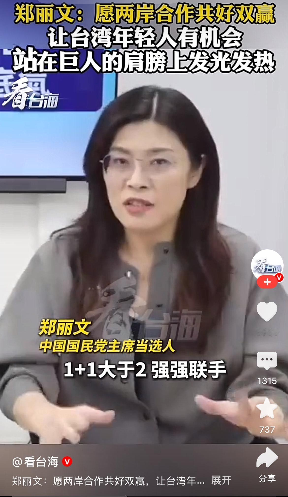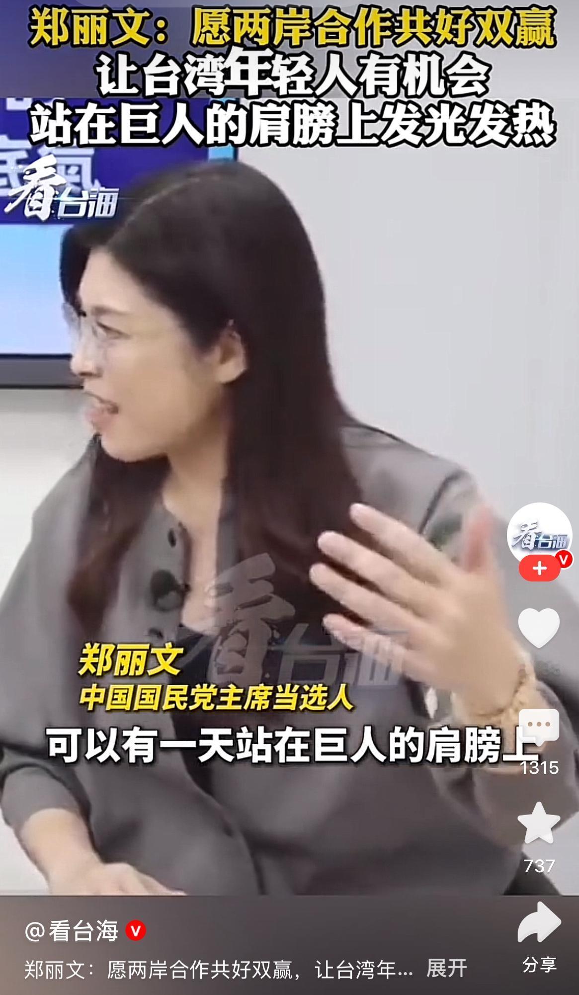 郑丽文提出的“大陆的底气就是台湾底气”这一观点,是她当选中国国民党主席后对两岸关系的重要论述。 郑丽文认为,两岸的底气紧密相连,主要体现在以下几个层面: • 经济相互依存:台湾对大陆的贸易依存度高达42%,大陆庞大的市场是台湾半导体、农业等产业发展和利润保障的关键支撑。两岸经济是互利共赢的关系。 • 文化同源同种:郑丽文强调,从传统节日、语言到历史文物,两岸拥有共同的中华文化根基,这是“打断骨头连着筋”的血脉纽带,也是底气最深厚的来源。她明确表示“我们就是中国人,台湾人就是中国人”。 • 国际空间依托:大陆的国际地位和影响力为台湾提供了不可替代的依托。有分析指出,若脱离大陆,台湾的国际活动空间将大幅缩水。