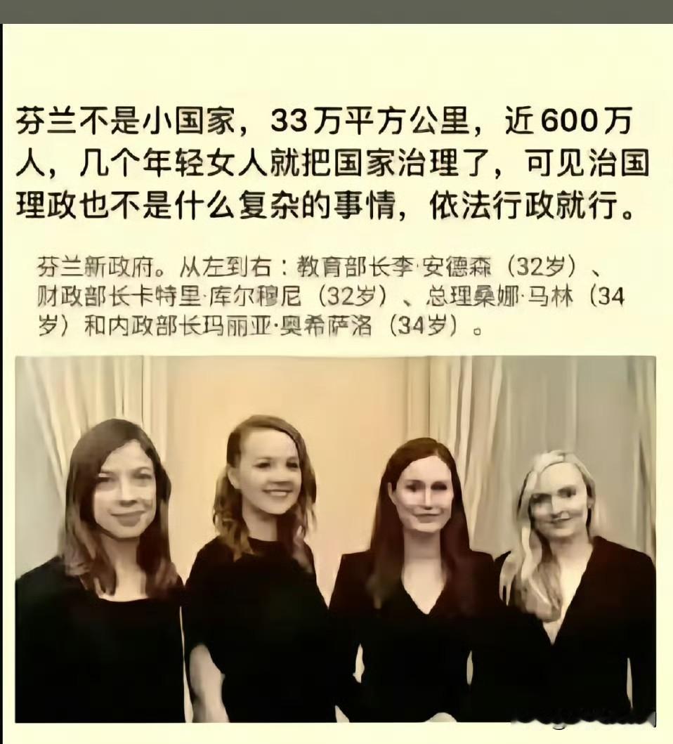 中国也有女县长和县委书记啊。芬兰人口也就一个县的规模,不明白说这个话啥意思,现在国内女公务员早就比男人多了