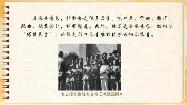 在延安鲁艺,任虹也是位多面手。吹口琴、作曲、指挥、配曲、服装设计,样样精通。此外,他还是全延安唯一的钢琴“保健医生”,还能利用口琴音准的优势为钢琴校音。