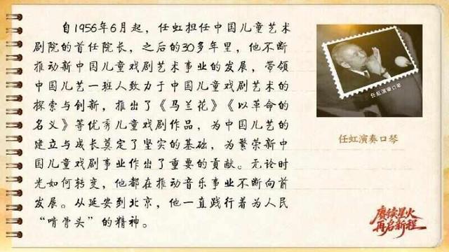 自1956年6月起,任虹担任中国儿童艺术剧院的首任院长,之后的30多年里,他不断推动新中国儿童戏剧艺术事业的发展,带领中国儿艺一班人致力于中国儿童戏剧艺术的探索与创新,推出了《马兰花》《以革命的名义》等优秀儿童戏剧作品,为中国儿艺的建立与成长奠定了坚实的基础,为繁荣新中国儿童戏剧事业作出了重要的贡献。无论时光如何转变,他都在推动音乐事业不断向前发展。从延安到北京,他一直践行着为人民“啃骨头”的精神。